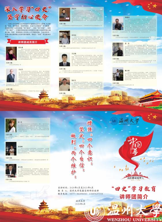 讲师团成员包括全国优秀教师、全国教育系统巾帼建功标兵并长期从事中共党史等教学研究和基层理论宣讲工作的张小燕教授,全国高校思政课教学标兵、曾应邀参加全国学校思想政治理论课教师座谈会的马克思主义学院院长卓高生教授等众多专家学者。他们精心准备了《融通‘四史’,深入理解中国道路与中国共产党》《近代温州的红色基因》《解读长征与长征精神》《重温抗战与抗战精神》《学党史,明初心,知使命》《温州改革开放史》等一系列“四史”金课,陆续到校内外各单位开展宣讲活动,掀起“四史”学习教育的热潮。