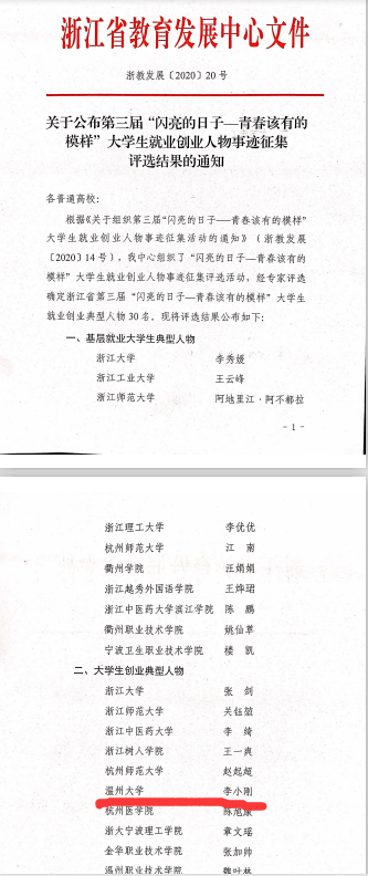 年轻需要精彩,青春需要创业。近日,由浙江省教育发展中心主办的第三届“闪亮的日子—青春该有的模样” 大学生就业创业人物事迹评选结果公布,我校机电工程学院2019届硕士毕业生李小刚荣获“大学生创业典型人物”称号。