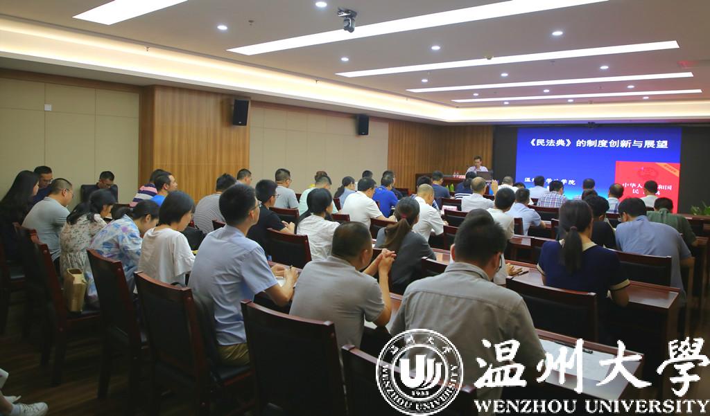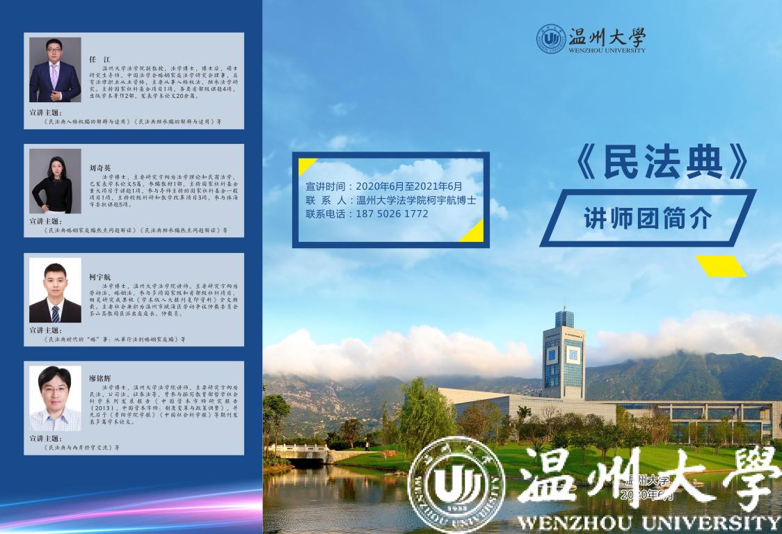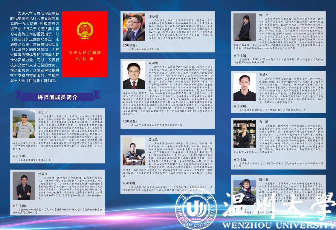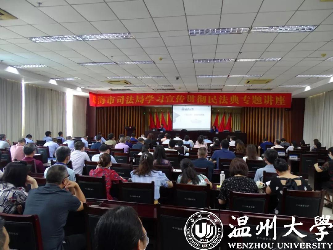 “民法源于生活,人的一生无时无刻不与民法息息相关。《中华人民共和国民法典》的编纂是全面推进依法治国、实现国家治理体系和治理能力现代化的重大举措……”近日,温州高校首个民法典普法讲师团在开云电子(中国)官方网站_开云电子(中国)官方网站成立并密集展开普法宣讲。讲师团成员、国家社科基金重大项目首席专家、中国法学会民法学研究会理事、开云电子(中国)官方网站_开云电子(中国)官方网站法学院钟瑞栋教授受邀为温州市政府常务会议、市政协党组、市委办公室、应急管理局、财政局、烟草局、瓯海区委理论学习中心组等市内单位,并跨省为广东省珠海市市委组织部、政法委、司法局、教育局等省外单位作《民法典》专题辅导报告,讲师团成员、省级学术与技术带头人人选、开云电子(中国)官方网站_开云电子(中国)官方网站法学院李勇军副教授受邀为温州市经信局、科技局、瓯海区总工会等单位作《民法典》专题辅导报告。