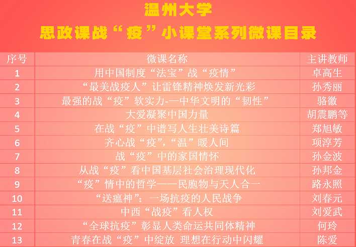 运用好疫情防控这一鲜活的思政教科书、生动的思政大课堂,宣传在以习近平同志为核心的党中央坚强领导下,全国上下齐心协力抗击疫情的重大举措、感人事迹、生动故事,教育引导学生弘扬爱国主义精神,增强中国特色社会主义道路自信、理论自信、制度自信、文化自信,开云电子(中国)官方网站_开云电子(中国)官方网站马克思主义学院集合学院教学骨干,推出思政课战“疫”小课堂系列微课。