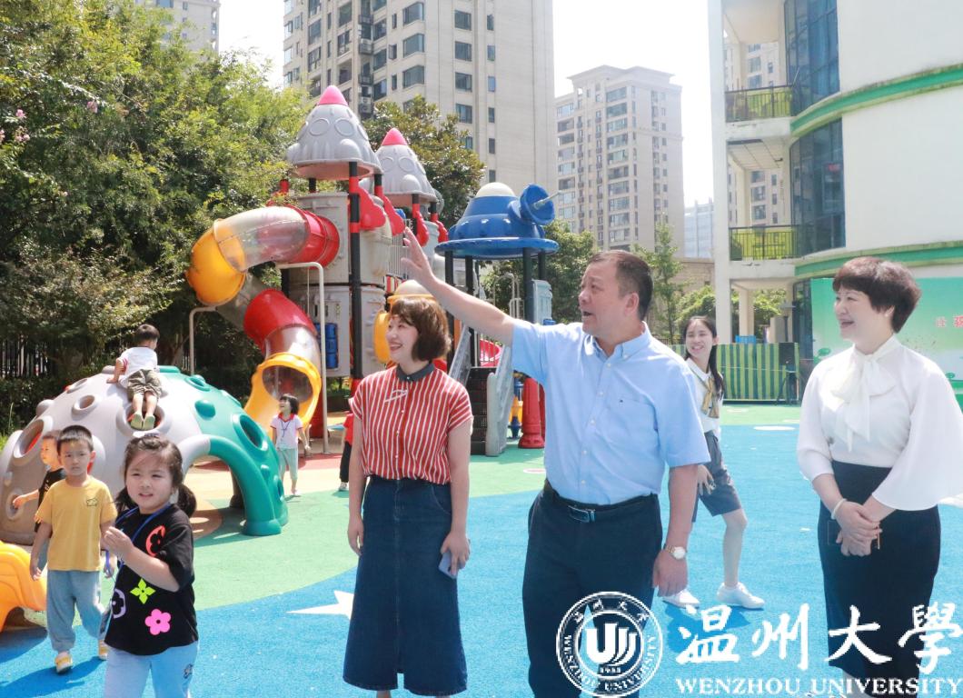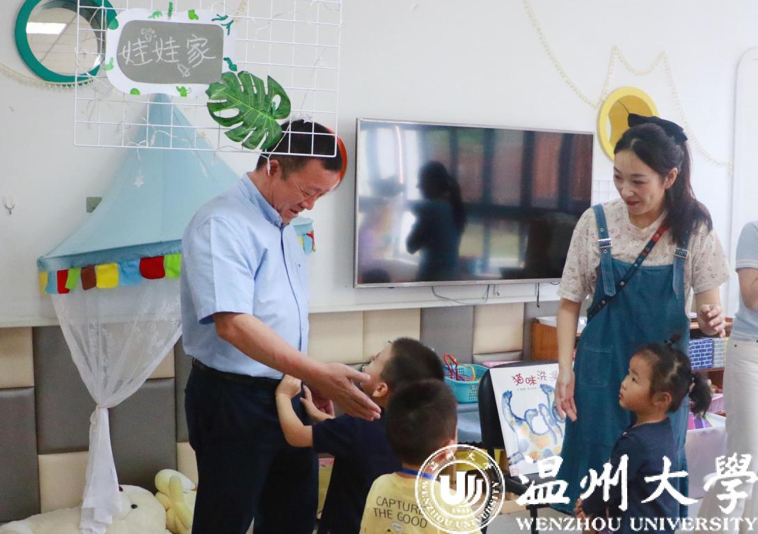 幼儿园园长陈娴、教职工代表与孩子们对谢树华一行的到来表示诚挚而热烈的欢迎。谢树华一行参观了温大附幼锦东园区校舍,并走进教室与孩子们亲切交流,了解他们的校园学习与生活情况。