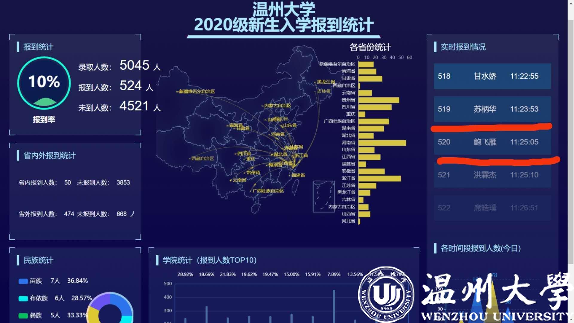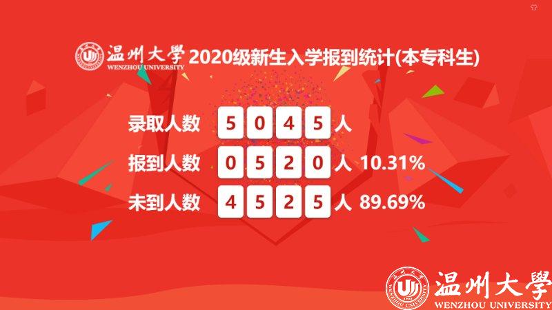 温州网对我校迎新工作进行了现场直播,5.4万人次在线观看。据悉,我校2020级新生人数10207人,其中研究生1303人,校本部本科生4076人,专科生863人,第二学士学位学生107人,国际学生100人,继续教育学院882人,瓯江学院2876人。按照学校安排,本科新生始业教育为9月26日-27日,9月28日正式上课;研究生新生始业教育为9月26-30日,10月9日正式上课。