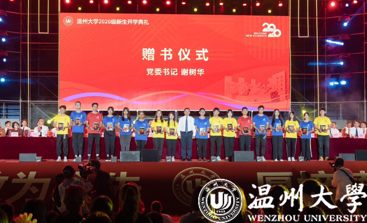 立身以立学为先,立学以读书为本。党委书记谢树华为2020级新生代表赠送三本书。其一《习近平的七年知青岁月》讲述了习总书记青年时期扎根黄土高原的青春故事,希望同学们从奋斗史中汲取大智慧,从真情怀中感受大担当。其二《神奇的符号》是著名数学家、温大老校长苏步青先生的自传,希望同学们从书中吸收科学养分,提高科学素养。其三《美的历程》是著名哲学家李泽厚先生的著作,描绘了我国文学和美学的千年发展历史,希望同学们识美、赏美、懂美,厚植人文情怀。所谓“科学求真、艺术求美、人文求善”,学校借由赠书仪式,希望同学们在大学期间多读书、善读书、读好书,努力成为政治素养、专业素养和人文素养相统一的栋梁之才。