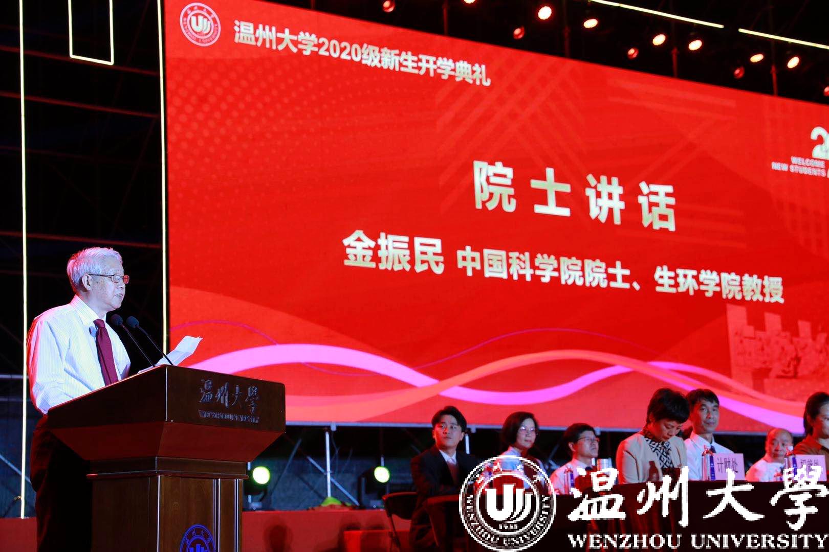 开学典礼上,中国科学院院士、著名地质学家、生环学院金振民教授就“为什么要读大学”这个问题给同学们送上宝贵的建议:要为崇高的时代和职业使命感而学习。金振民院士希望新生同学们提升生存、做人、学习和与他人相处这几项关键素养,在大学这个新起点上扬帆起航。他最后将自己的人生感悟汇成四句话送给2020级新生们:“仰望星空有理想,脚踏实地有担当,独立思考有创造,勤奋学习有修养。”以此勉励同学们不负时光、奋发向上。