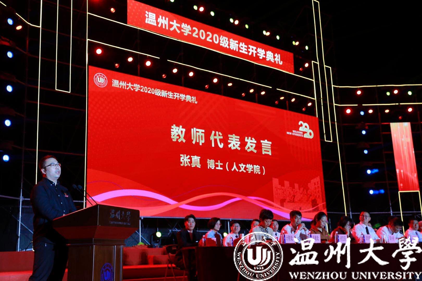 作为同学们成长成才的筑梦者和摆渡人,教师代表——人文学院的张真老师和新生们分享了求学生涯中三个生动的故事,以此鼓励大家要永远怀有梦想、永远心守信念、永远拥抱情怀,在温大书写人生新的华章。