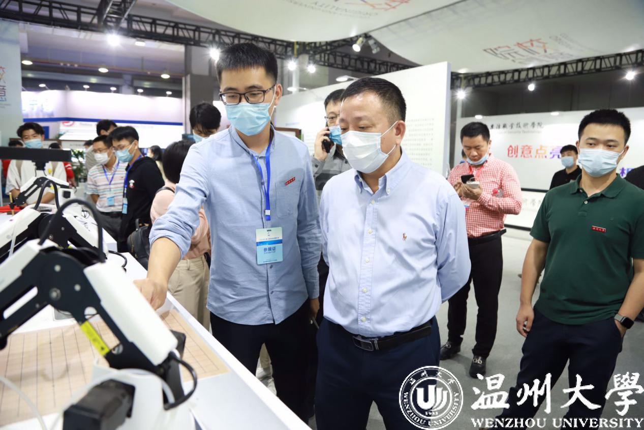 展示期间,校党委书记谢树华、副校长薛伟慰问了参展项目师生,听取了每一个项目的情况介绍。谢树华书记对参展项目给予了肯定,鼓励师生以本次大会为窗口,向温州市民展示学校双创成果,展现学校服务地方产业发展的决心和担当,同时依托温州创新创业发展机遇,增强项目科技创新力度,提升项目创业带动就业能力,引领更多青年学子留温回温创新创业。