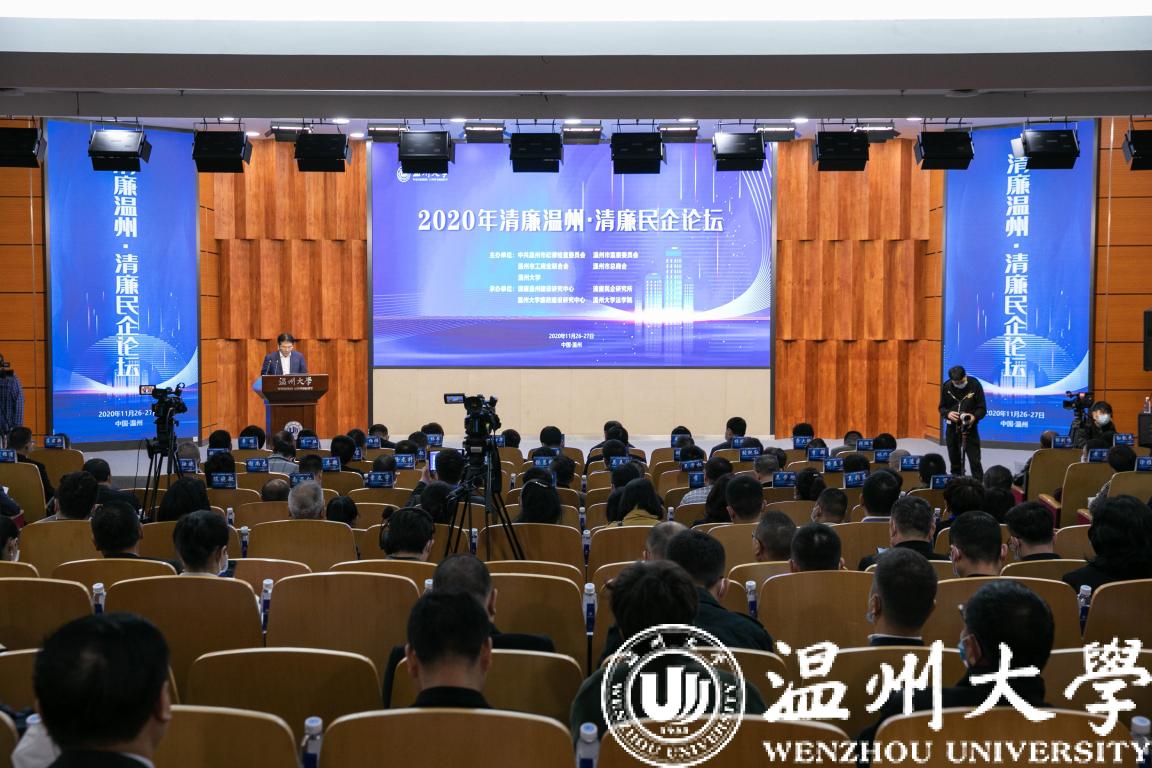 11月27日,由温州市纪委市监委、市工商联、市总商会、开云电子(中国)官方网站_开云电子(中国)官方网站联合主办的2020年清廉温州·清廉民企论坛在我校召开。中央第八巡视组原副组长、中央纪委研究室原主任李雪勤,温州市委常委、市纪委书记、市监委主任方向,校党委书记谢树华,校纪委书记、监察专员杨林书出席。来自全国部分地方纪检监察机关、工商联、温州市市县纪委领导和行业协会商会、清廉民企联盟会员企业代表、全国廉政建设领域知名专家学者和我校纪委、法学院、廉政建设研究中心、二级学院纪委相关负责人等300余位嘉宾参加了论坛。
