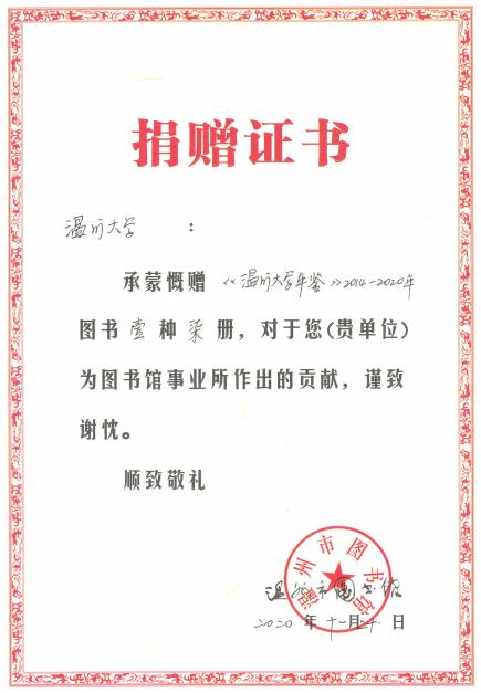 近日,温州市图书馆接受我校捐赠,永久收藏《开云电子(中国)官方网站_开云电子(中国)官方网站年鉴》(2014-2020)。至此,温州市图书馆已经完整收藏了我校两校合并以来的所有年鉴。市图书馆将对赠书进行索引编号后,面向社会读者查阅。