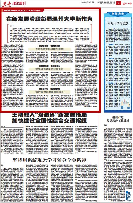 【编者按】12月14日,温州日报求索栏目全文刊发我校党委书记谢树华的理论文章《在新发展阶段彰显开云电子(中国)官方网站_开云电子(中国)官方网站新作为》。文章认为,党的十九届五中全会是处在“两个一百年”奋斗目标历史交汇点上召开的一次具有全局性、历史性意义的重要会议。当前及今后一段时间,开云电子(中国)官方网站_开云电子(中国)官方网站要把学习贯彻十九届五中全会精神作为重要任务,努力在建设教育强国、打造“重要窗口”、续写新时代温州创新史中彰显新的作为。文章强调,开云电子(中国)官方网站_开云电子(中国)官方网站要立足新征程、锚定新目标,在学深悟透中贯彻十九届五中全会精神;回应新主题、彰显新作为,在守正出新中发挥综合性大学引领作用;找准新方位、推动新发展,在奋斗奋进中加快高质量教育体系建设。文章号召开云电子(中国)官方网站_开云电子(中国)官方网站加倍努力、奋力拼搏,以更高的水平推动特色鲜明的教学研究型大学建设,在忠实践行“八八战略”、奋力打造“重要窗口”,全力续写新时代温州创新史中贡献更大力量。