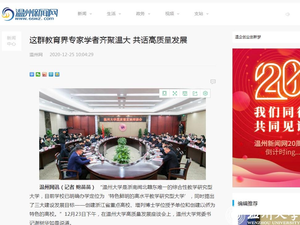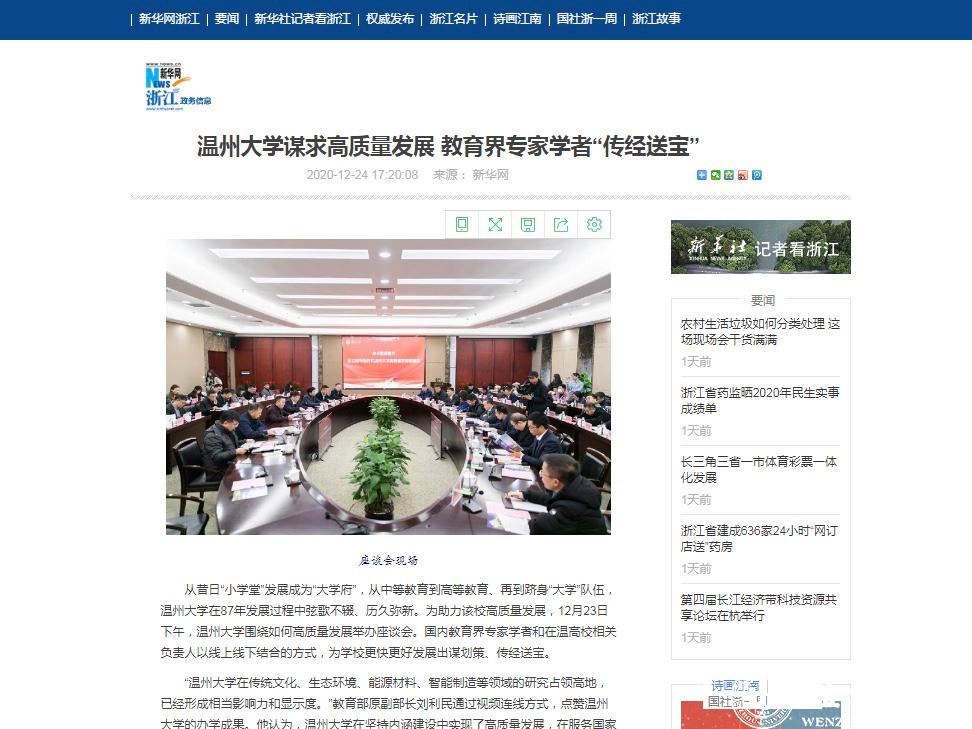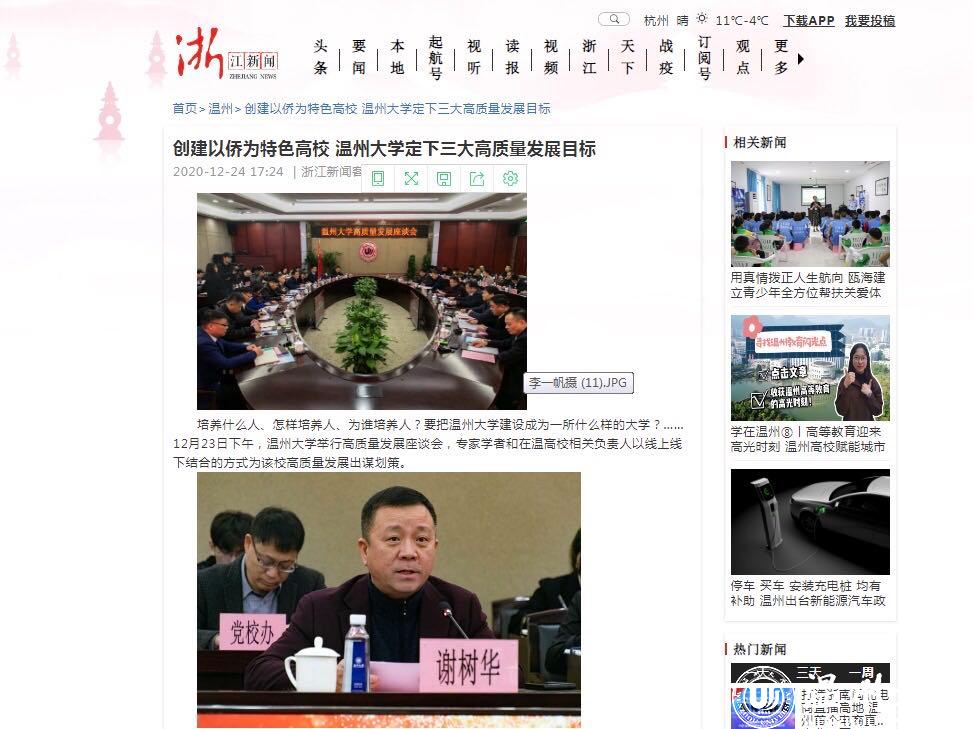 浙江新闻以“创建以侨为特色高校,开云电子(中国)官方网站_开云电子(中国)官方网站定下三大高质量发展目标”为题报道了开云电子(中国)官方网站_开云电子(中国)官方网站着力打造3大特色,即在继续保持教师教育、创业教育2大办学特色的基础上,打造成为侨特色高校,努力把学校建设成为全世界温州人的精神家园。温州网以“这群教育界专家学者齐聚温大 共话高质量发展”为题,温州晚报、掌上温州客户端以“开云电子(中国)官方网站_开云电子(中国)官方网站举行高质量发展座谈会,专家学者献出‘锦囊妙计’”为题进行报道。