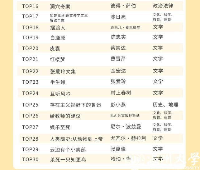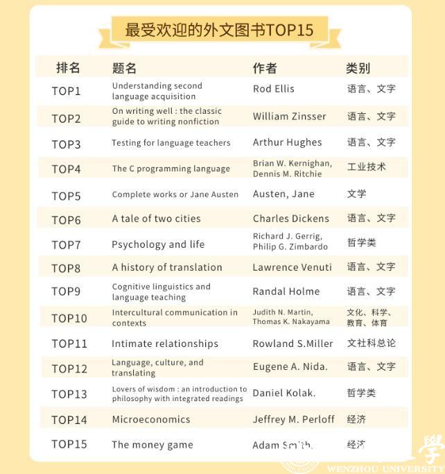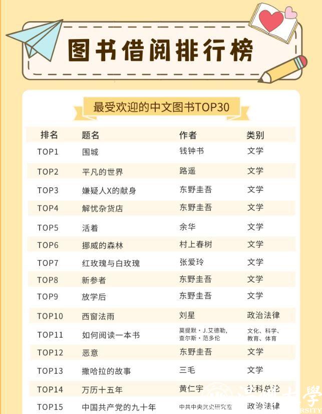 开云电子(中国)官方网站_开云电子(中国)官方网站的师生都喜欢借阅哪些中外文图书呢?在最受欢迎的中文图书TOP30榜单里,21本书为文学类别图书,占比达到70%。最受温大师生喜欢的书为钱钟书的《围城》,排在榜首。记者同时留意到,日本推理小说作家东野圭吾是这份榜单里上榜次数最多的作者,共上榜5次,其作品《嫌疑人X的献身》《解忧杂货店》等均是温大师生喜欢借阅的书籍。