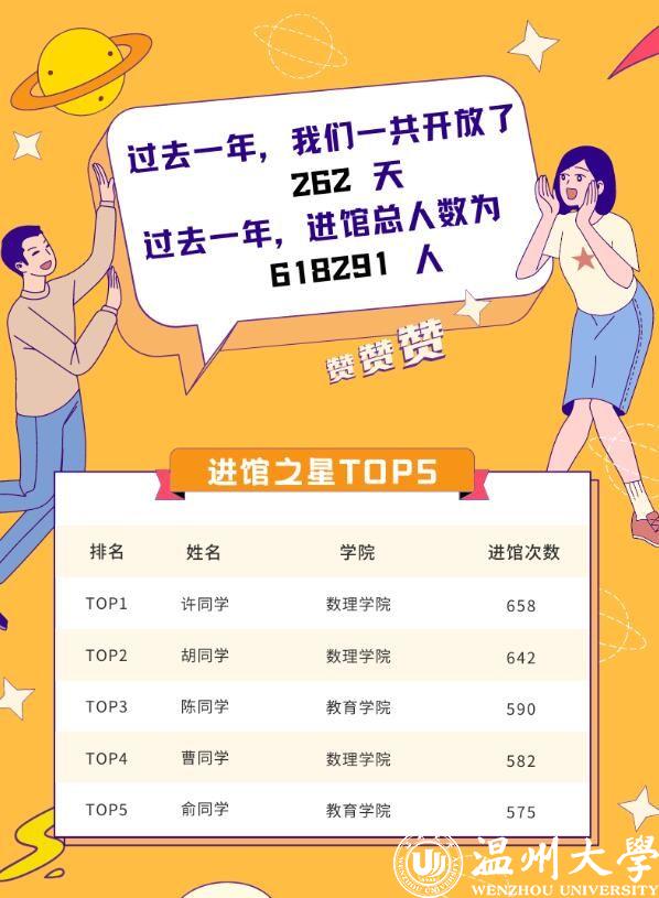 该份报告还对读者借阅次数进行了排名。读者借阅排行榜(本科生组)显示,排在第一位的蒋同学借阅次数高达113次,也即在图书馆开放的262天里,他平均0.43天借阅一次。与学生相比,温大教师的借阅次数会更多。读者借阅排行榜(教师组)显示,前三名教师的借阅量分别为172次、146次、134次。教师榜前三名的借阅总量达到452次,比本科生榜前三名的借阅总量289次多出163次。