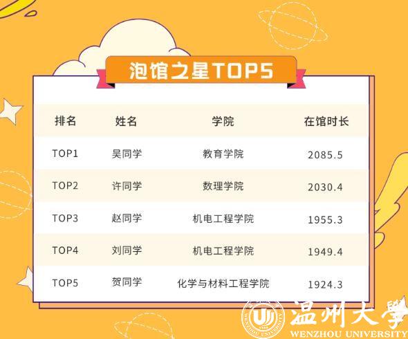 记者看到,“泡馆之星TOP5”榜单里的5名学生分别来自教育学院、数理学院、机电工程学院(2人)、化学与材料工程学院4个学院。榜首吴俐瑶的“泡馆”时长达到2085.5小时,约等于86.9天。在金华读完专科的她,于2019年考入开云电子(中国)官方网站_开云电子(中国)官方网站学前专升本(师范)专业,今年计划完成自己的二级跳——考取开云电子(中国)官方网站_开云电子(中国)官方网站研究生。“我最早试过6点40分就到图书馆开始复习了。”回忆起在图书馆奋战的那段时光,吴俐瑶颇有感触。