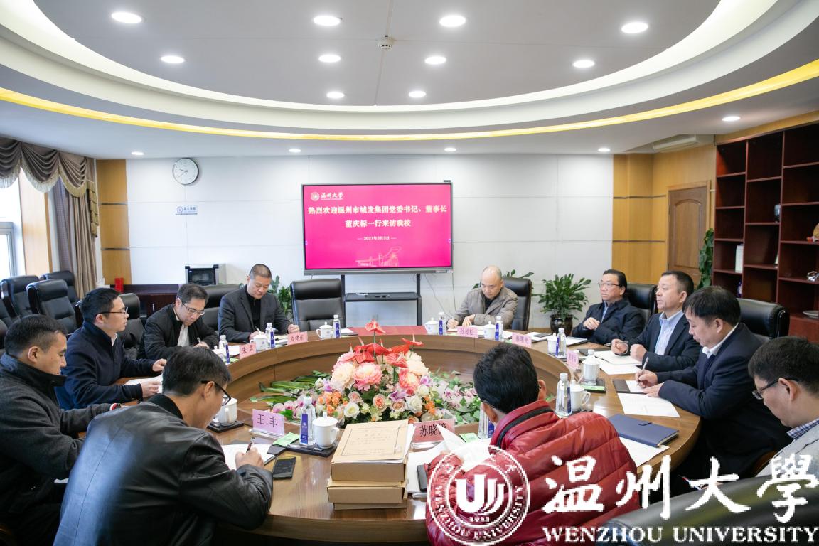 3月3日上午,温州城发集团党委书记、董事长董庆标一行来校调研交流工作。校党委书记谢树华、校长赵敏、副校长蔡曙光出席接待。双方就进一步深化校企合作进行座谈交流。