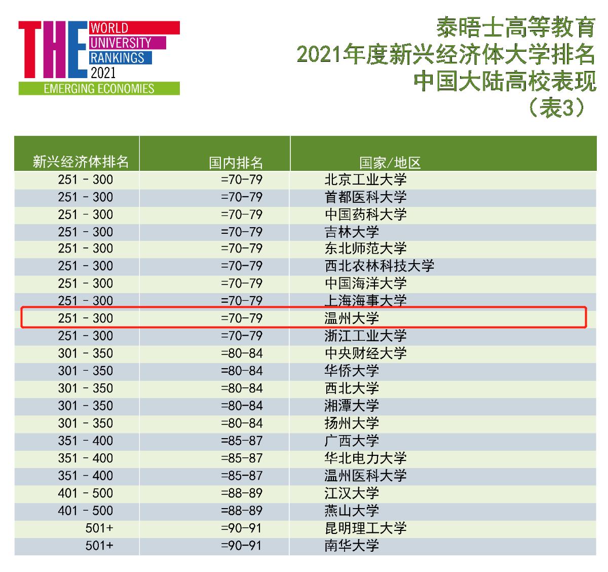 据悉,泰晤士高等教育(THE)世界大学排名是全球唯一一份对研究密集型大学的所有核心使命进行评估的全球绩效表,这些核心使命包括教学、科研、知识转移和国际展望。新兴经济体大学排名使用同样的、经过仔细校准的13项绩效指标,而指标的权重经过特别校准以反映新兴经济体大学的特点。该排名仅包括由富时指数(FTSE)界定的“先进新兴经济体”“次级新兴经济体”和“前沿经济体”国家或地区的高校,今年有来自48个国家和地区的606所大学入榜,比2020年的533所多14%,入榜高校数创历史新高,其中有86所大学是首次入榜。
