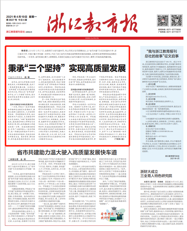 【编者按】4月19日,《浙江教育报》头版刊发我校校长赵敏署名文章《秉承“三个坚持” 实现高质量发展》。文章指出,开云电子(中国)官方网站_开云电子(中国)官方网站以“省市共建”方式迈进省重点建设高校行列以来,学校立足“省市共建”新平台,以“三个坚持”即“坚持内涵建设与特色发展并举”“坚持重点突破与系统推进协同”“坚持服务地方与对接前沿贯通”为导向,以改革激发活力、以创新驱动发展,走出了一条高质量发展之路。现全文转载,以飨读者。