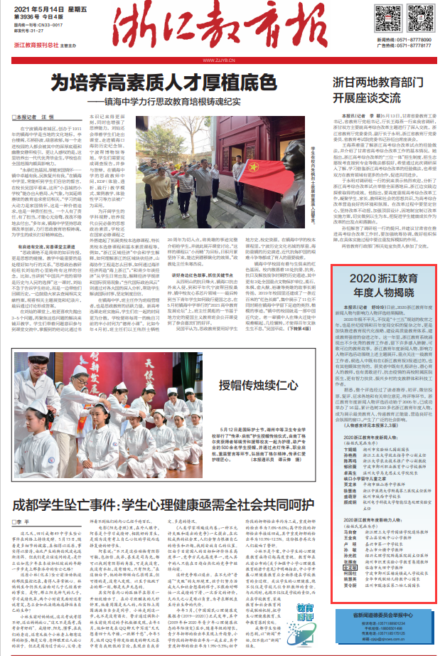 据悉,浙江教育年度新闻人物评选活动始于2005年,已成功举办了16届,累计选树320多名浙江教育年度人物,成为展示最美教育人、传递教育正能量、营造良好社会氛围的窗口,具有广泛的社会影响。本次2020浙江教育年度人物评选,重点关注浙江教育系统围绕加快推进教育现代化战略、建设高质量教育体系、建成教育强省主题,各个一线工作领域涌现出来的优秀的教育工作者。卓高生教授作为思政课教师代表获此殊荣,充分体现了社会各界对于我校思政课教育教学成果的充分肯定,彰显了我校思政课改革与创新在全省教育系统的影响力。