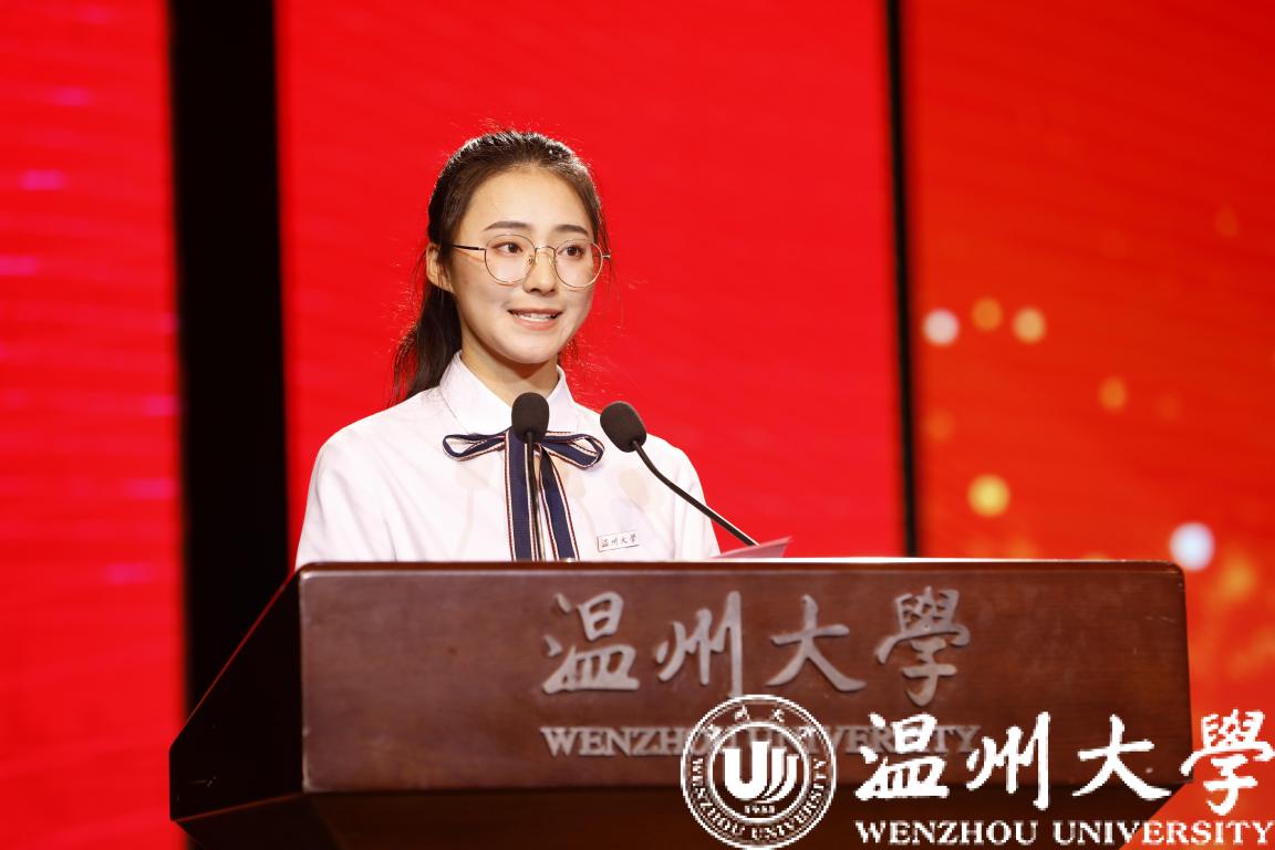 汤文晗同学作为本专科生新生代表发言。她向新生们发出青春号召:“让我们奋斗正青春,做一名心中有梦、眼里有光的温大学子!”