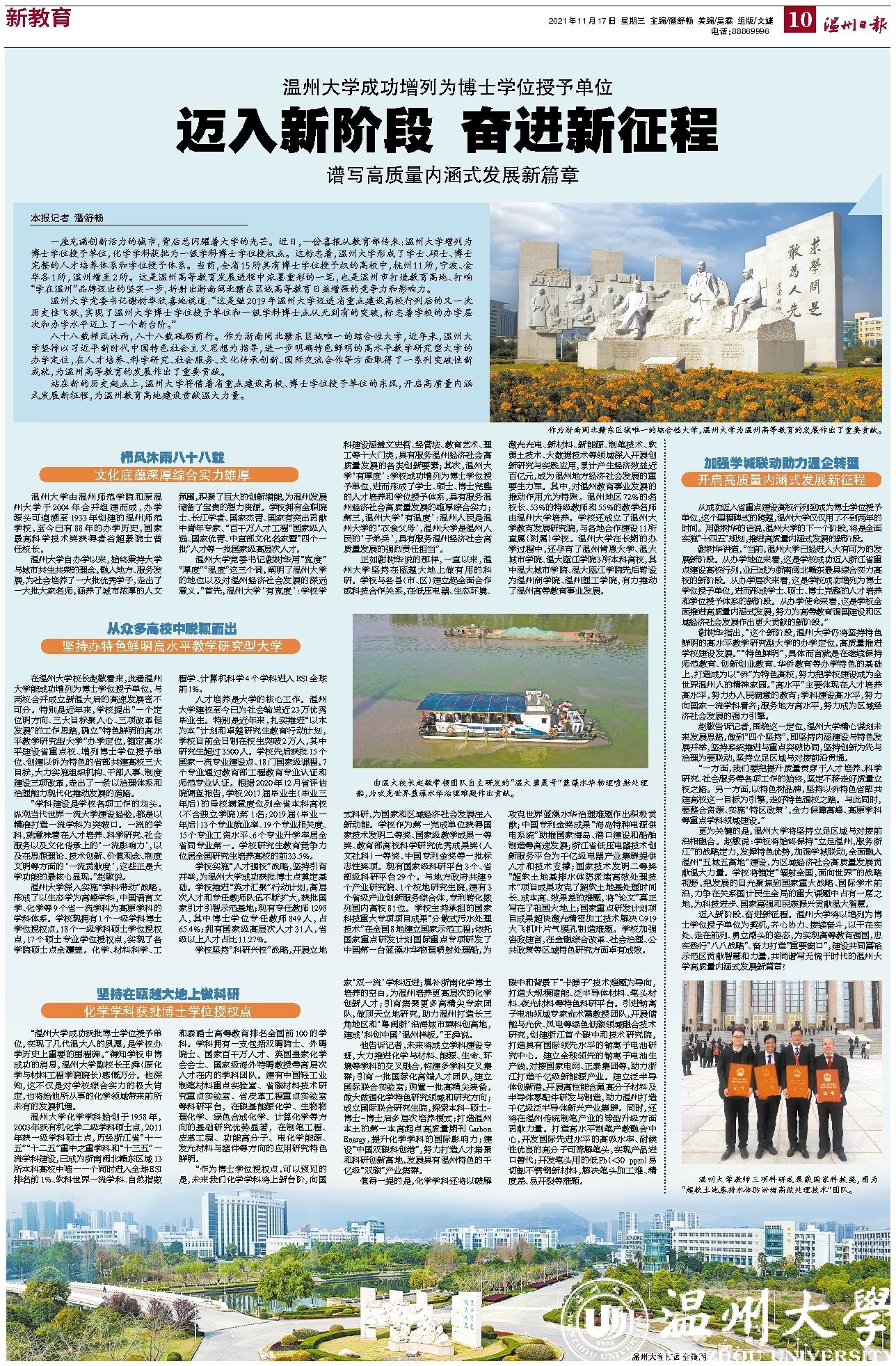 “作为博士学位授权点,可以预见的是,未来我们化学学科将上新台阶,向国家‘双一流’学科迈进;填补浙南化学博士培养的空白,为温州培养更高层次的化学创新人才;引育集聚更多高精尖专家团队,做顶天立地研究,助力温州打造长三角地区和‘粤闽浙’沿海城市群科创高地,建成‘科创中国’温州样板。”王舜说。