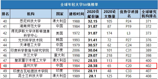 被自然指数选定为年轻大学(包括研究生院)的是成立于1971年或以后的独立大学。此外,这些大学必须是纳入2020年自然指数前750所学术机构的大学。根据2020年文章份额排名的全球年轻大学50强中,有23所中国大学,我校位列其中,充分彰显出近年来我校在人才培养、科学研究、社会服务等方面取得的长足进步和良好发展态势。