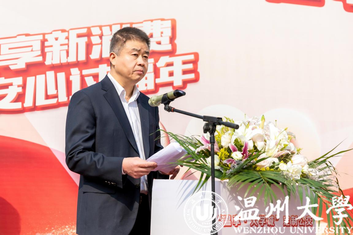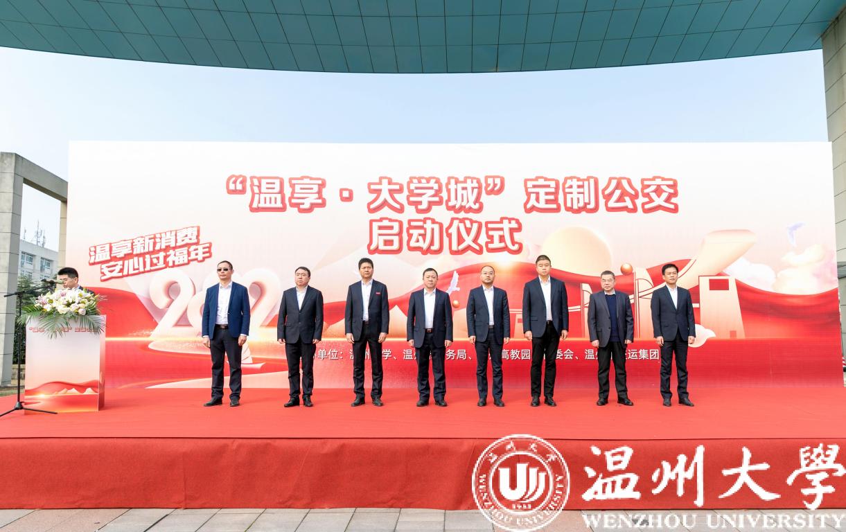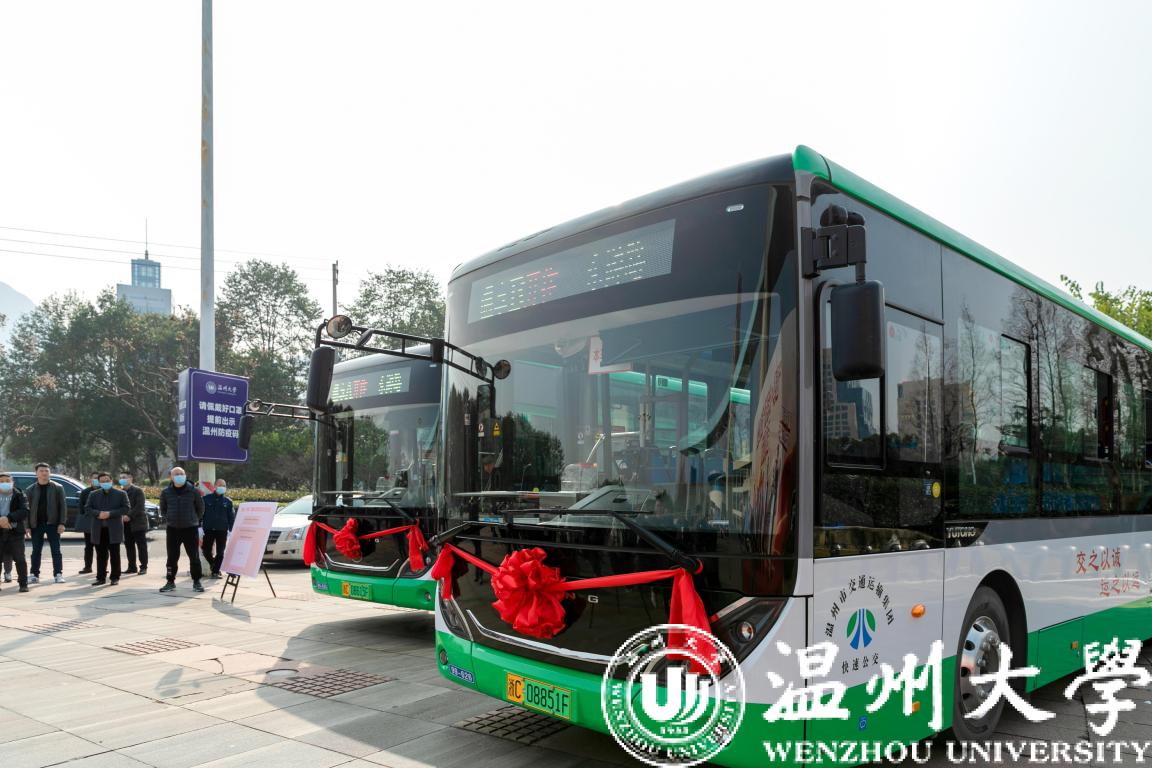 2月27日,“温享·大学城”定制公交启动仪式在开云电子(中国)官方网站_开云电子(中国)官方网站举行。温州市副市长陈宽、商务局局长彭魏滨、交运集团董事长朱祖荣、校党委书记谢树华、副书记庄兴忠等领导出席活动。