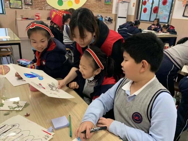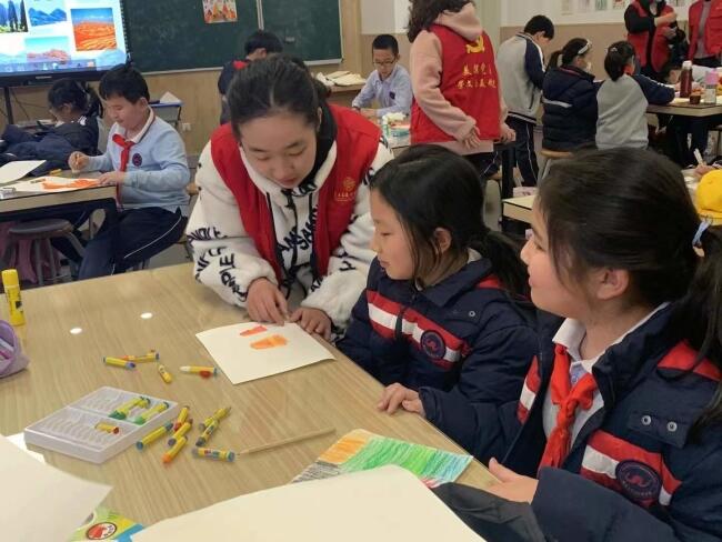 为了保证课堂教学质量,美术与设计学院24名志愿者组建成4个第二课堂“金课”备课组,以爱国主义教育和中国特色社会主义文化为中心,根据学生年龄特点和学段要求,立足美育,研究制定“体验美、发现美、培育美、创造美”课程总体目标,编制“美育+思政”教学计划,将“双减”后的“第二课堂”打造得有声有色。为了激发学生艺术创新能力,党员吴杰带领队员们围绕“青花瓷”“草鞋”“红船”“神州十三号”四个主题,通过绘画、书法、扎染、剪纸、摄影等多样的艺术形式开展了“创造‘美’”的系列思政艺术课堂,勉励学生们要坚定文化自信,勇于开拓创新。“这样的美术课真有趣!”“跟着大学生哥哥姐姐们一起学习,现在我更喜欢画画了!”小学生们纷纷表示欢迎。