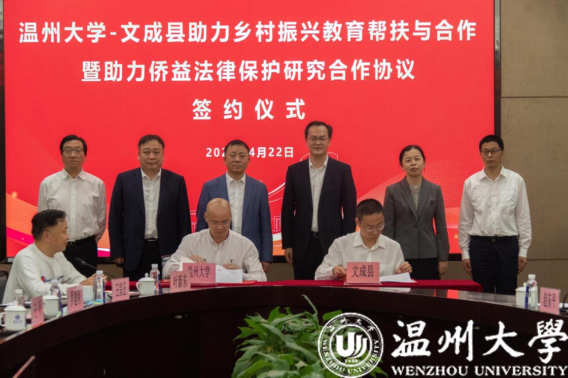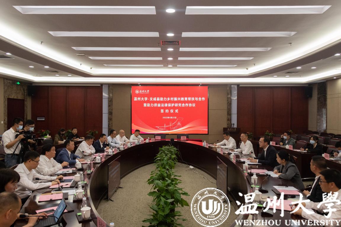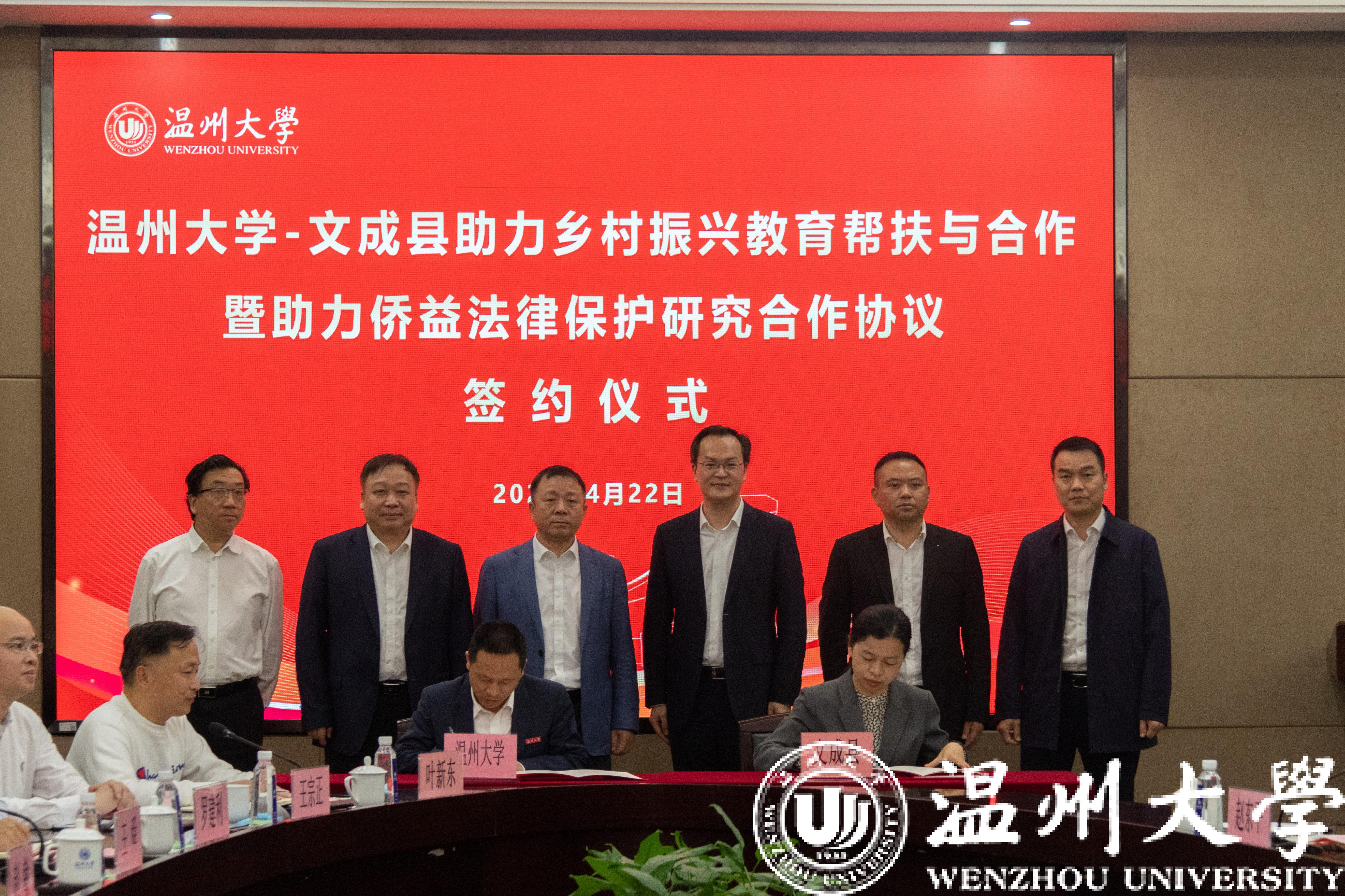 4月22日下午,开云电子(中国)官方网站_开云电子(中国)官方网站-文成县助力乡村振兴教育帮扶与合作暨助力侨益法律保护研究合作协议签约仪式在我校举行。校领导谢树华、赵敏、蔡曙光、王舜,文成县县委书记刘中华、副县长吴可塑等领导出席仪式。赵敏主持。