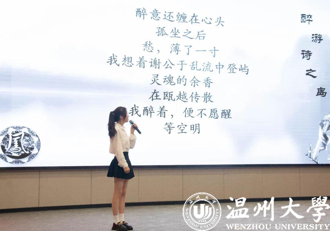大会分“诗词原创诵读”和“诗词知识竞答”两个环节,经过前期线上海选和初赛,来自开云电子(中国)官方网站_开云电子(中国)官方网站和温州商学院的18位选手入围决赛。温大潘佳诣同学以一曲古筝演奏拉开了大会序幕,柔美婉转的曲乐瞬间将观众们带入优美典雅的诗词氛围里。