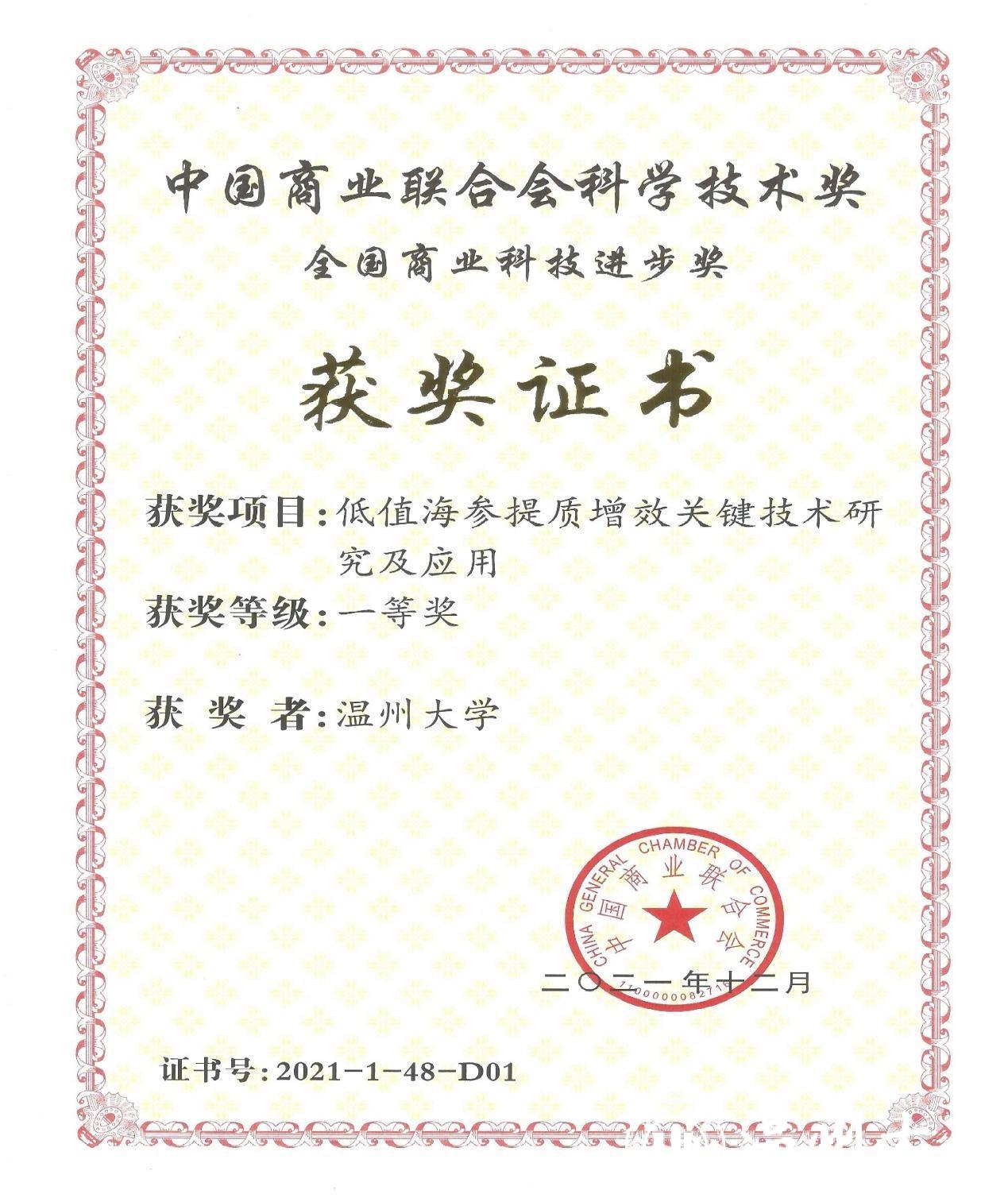 近日,全国商业科技质量大会暨2021年全国商业科技进步奖颁奖仪式通过线上、线下相结合的方式在北京举行。商务部原副部长张志刚、姜增伟等领导出席会议。我校生命与环境科学学院苏来金副教授领衔的“低值海参提质增效关键技术研究及应用”项目荣获全国商业科技进步奖一等奖。这是该奖项自2002年设立以来我校首次荣获一等奖。