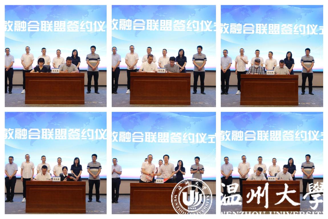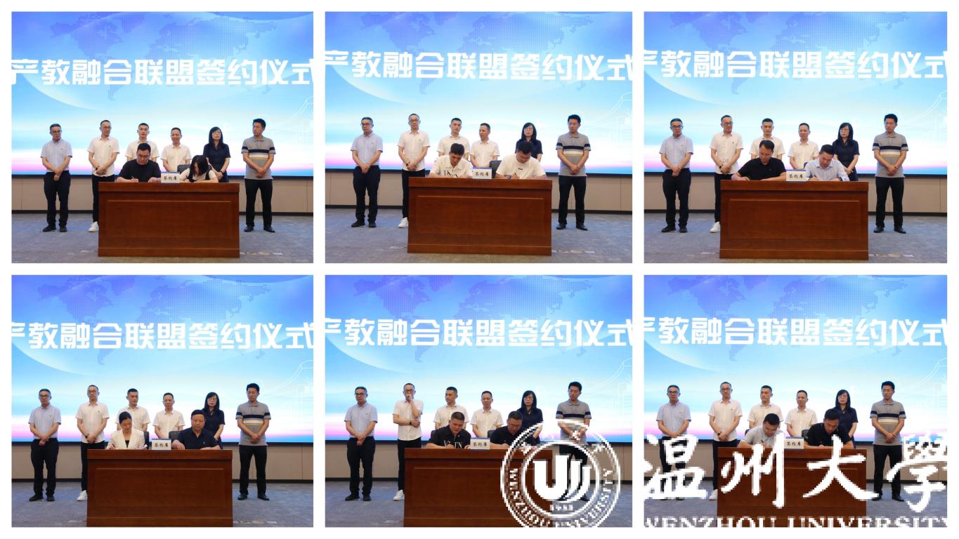 瓯海区总商会与开云电子(中国)官方网站_开云电子(中国)官方网站签订战略合作协议,共同成立产教融合联盟,瓯海区服装行业、眼镜行业等11家会员单位与温州职业技术学院、浙江安防职业技术学院等学校进行产教融合联盟签约。