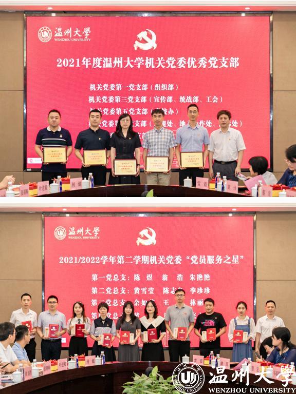 机关党委表彰了2021年度优秀党支部以及2021/2022学年第二学期“党员服务之星”,通过评选先进、选树典型来引导党员干部重服务、出实效,以党建引领凝聚起强大的战斗力。“党员服务之星”代表黄弦和围绕在平凡工作中的坚持、在为师生办实事上的努力、在服务窗口一线的磨练等方面作交流发言,并作为机关党员代表宣读《勇当先、走在前、作表率——进一步加强机关作风建设的倡议书》,倡议机关全体党员干部以“永远在路上”的执着,把讲政治、守规矩、严纪律、转作风落到实处,以饱满的激情、坚定的信念和昂扬的斗志,在作风建设中勇当先锋,争作表率。