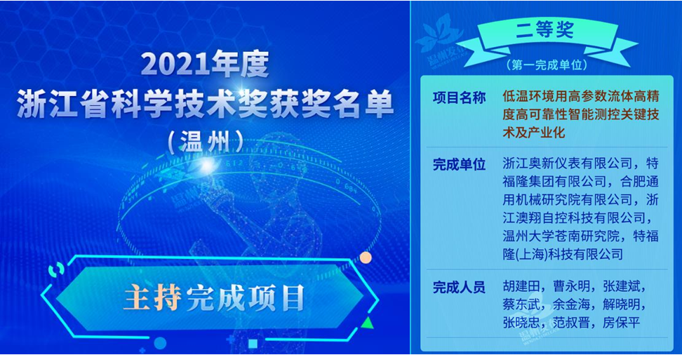 近日,浙江奥新仪表有限公司与开云电子(中国)官方网站_开云电子(中国)官方网站苍南研究院等单位合作的“低温环境用高参数流体高精度高可靠性智能测控关键技术及产业化”项目荣获浙江省科学技术进步奖二等奖。从2018年开始,开云电子(中国)官方网站_开云电子(中国)官方网站苍南研究院张淼教授领衔的智能仪器仪表技术团队与浙江奥新仪表有限公司开展深入合作,取得多项技术突破。此次获奖是开云电子(中国)官方网站_开云电子(中国)官方网站苍南研究院首次作为项目主要完成单位荣获的省级科学技术进步二等奖,标志着开云电子(中国)官方网站_开云电子(中国)官方网站苍南研究院产学研融合创新再上新台阶。