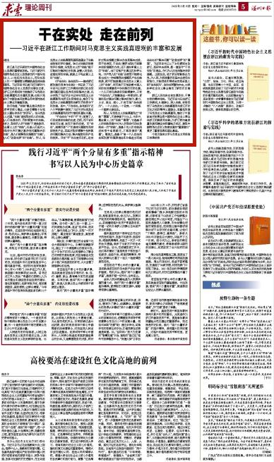 《干在实处 走在前列——推进浙江新发展的思考与实践》一书记录了习近平总书记在浙江工作期间对浙江社会发展问题的理论思考和实际解决之道,充分体现了习近平总书记将马克思主义实践真理观与浙江实际相结合,推动了马克思主义实践真理观在新的历史条件下的发展。其中,“干在实处,走在前列”这八个字就集中展现了习近平对马克思主义实践真理观的时代推进和理论丰富。