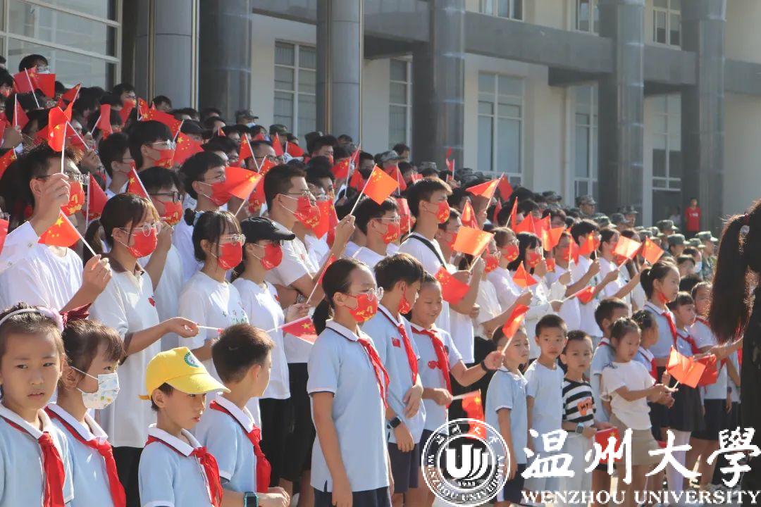 伴随着诗朗诵“吹号者以行进号,给前进着的步伐,做了优美的拍节”,在合唱歌曲《我和我的祖国》的音乐声中,全体师生共同挥舞着手中的国旗,用歌声表达对祖国母亲的祝福。