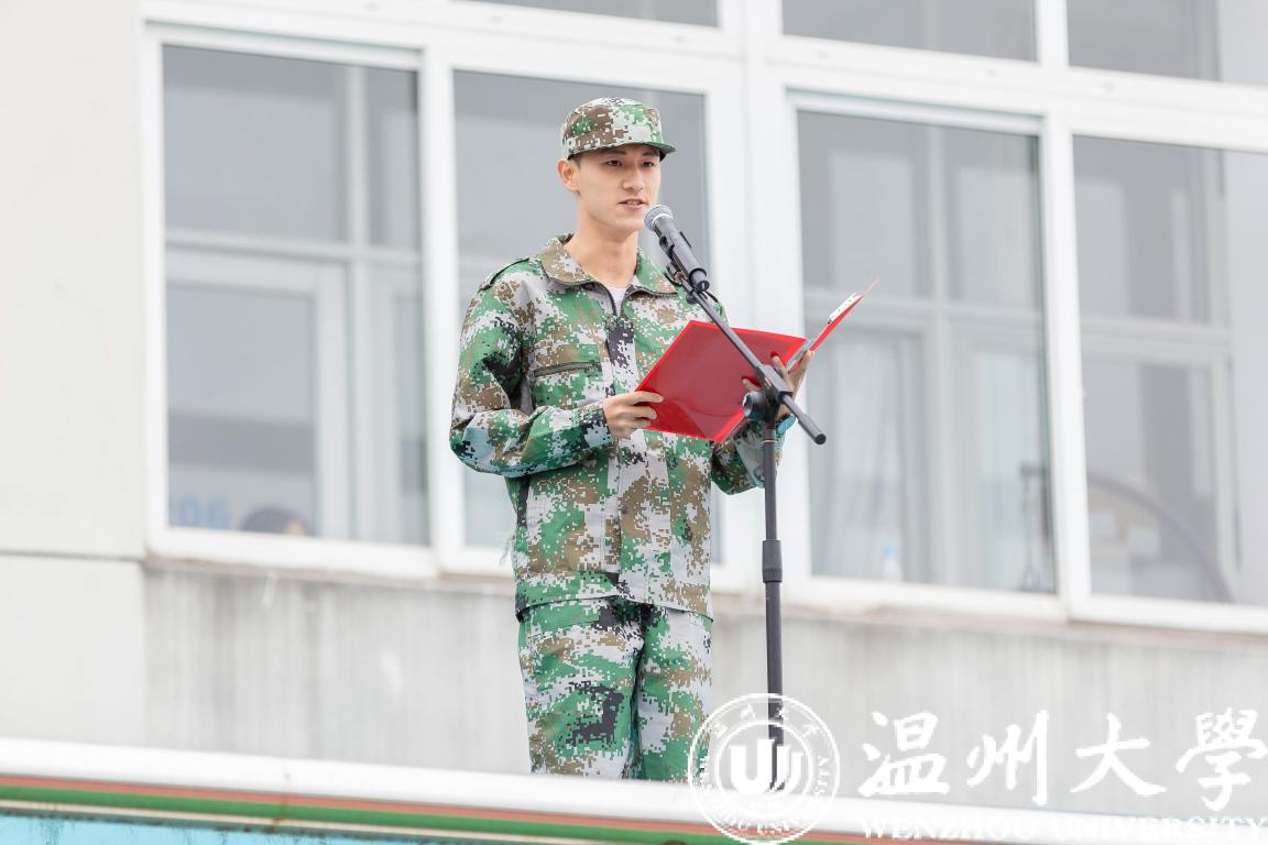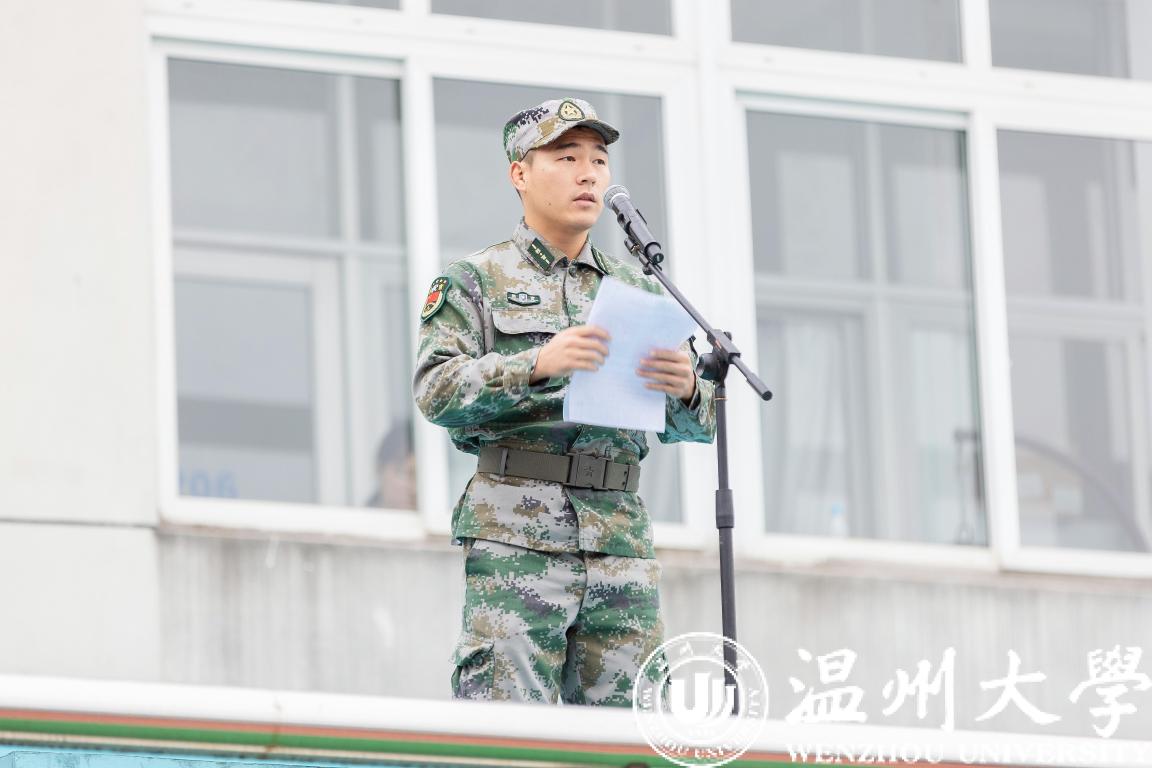 军训教官王超发言。他希望同学们端正思想,认真对待军训。机电工程学院新生薛丁珲代表全体参训学生发言,做出一切听从指挥、服从命令,高质量完成军训的承诺。