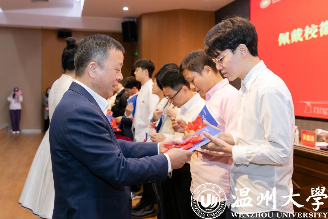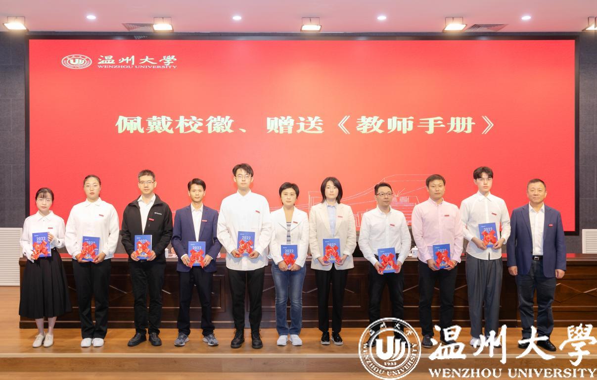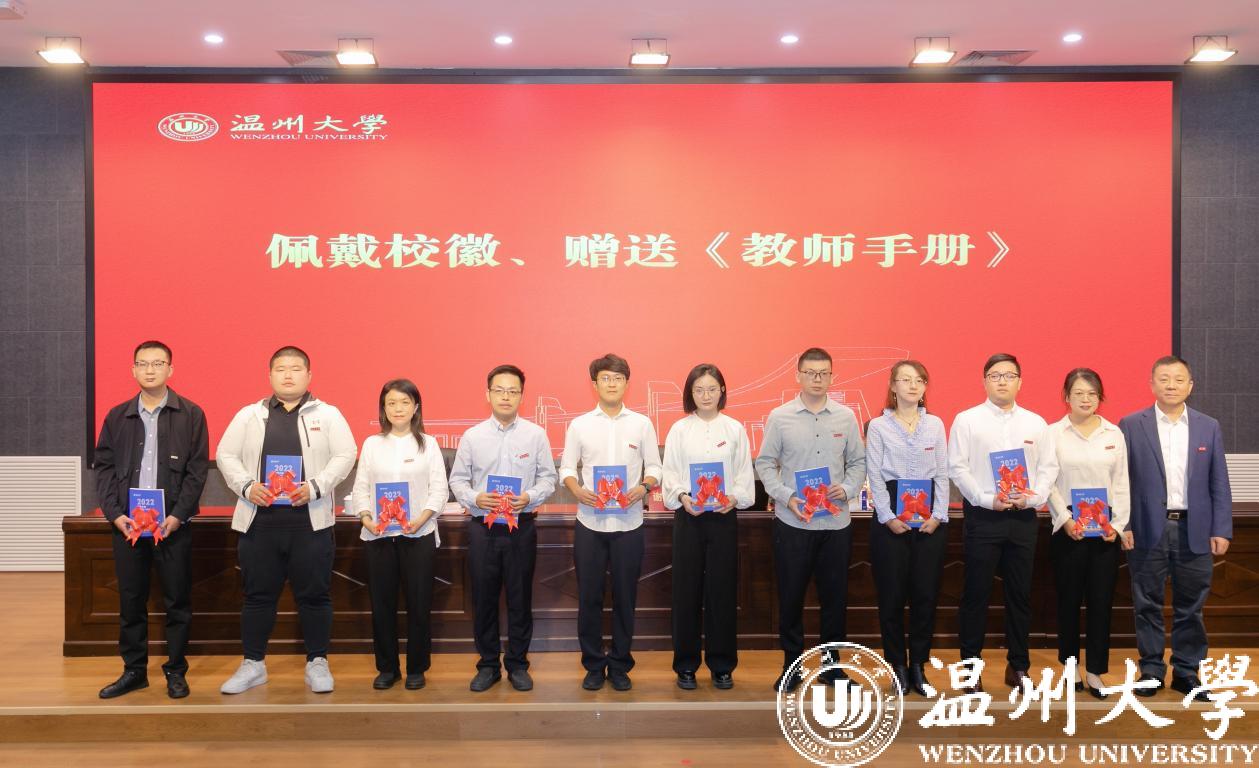 谢树华为新教师代表佩戴校徽,并赠送2022版《开云电子(中国)官方网站_开云电子(中国)官方网站教师手册》,表达学校对新入职教师的热烈欢迎和殷切期望,希望新教师提升“温大人”的归属感和责任感,勉励每一位新入职教师开拓进取、奋勇向前。