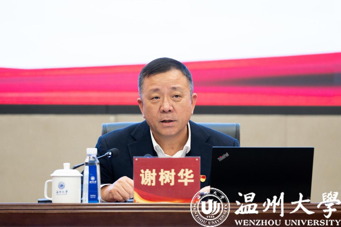 谢树华强调,深刻领悟贯彻党的二十大重要精神和核心要义,对于我们不断谱写新时代中国特色社会主义新篇章、奋力实现中华民族伟大复兴的中国梦有着重要指导作用和现实意义。一要深刻领悟大会主题统摄全局的重大战略考量。大会主题系统集成“国之大者”,统摄战略全局,既是大会的灵魂,也是党和国家事业发展的总纲,是深入学习贯彻党的二十大精神的关键。二要深刻领悟新时代十年伟大变革的重大里程碑意义。新时代十年伟大变革,从理论上讲是原创性、突破性、开创性的;从制度上讲是创新性、整体性、系统性的;从实践上讲是根本性、战略性、长远性的。三要深刻领悟马克思主义中国化时代化新的飞跃的重大理论创新。党的二十大报告深入总结我们党坚持和发展马克思主义的历史经验,系统阐述“两个结合”的要求,精辟概括习近平新时代中国特色社会主义思想贯穿的立场观点方法,号召全党继续推进实践基础上的理论创新,不断开辟马克思主义中国化时代化新境界。四要深刻领悟以中国式现代化全面推进中华民族伟大复兴的重大历史使命。中国式现代化是人口规模巨大的现代化、全体人民共同富裕的现代化、物质文明和精神文明相协调的现代化、人与自然和谐共生的现代化、走和平发展道路的现代化。五要深刻领悟推进社会主义现代化国家建设的重大系统部署。特别是高质量发展已经成为首要任务、教育科技人才“三位一体”的地位更加突显、侨务事业肩负着重要的时代使命、全面依法治国是国家治理的深刻革命等方面,与学校发展密切相关。六要深刻领悟坚持党的全面领导和全面从严治党的重大任务要求。必须坚持党中央集中统一领导,必须把“两个确立”作为最高政治原则,必须坚持党的自我革命永远在路上。