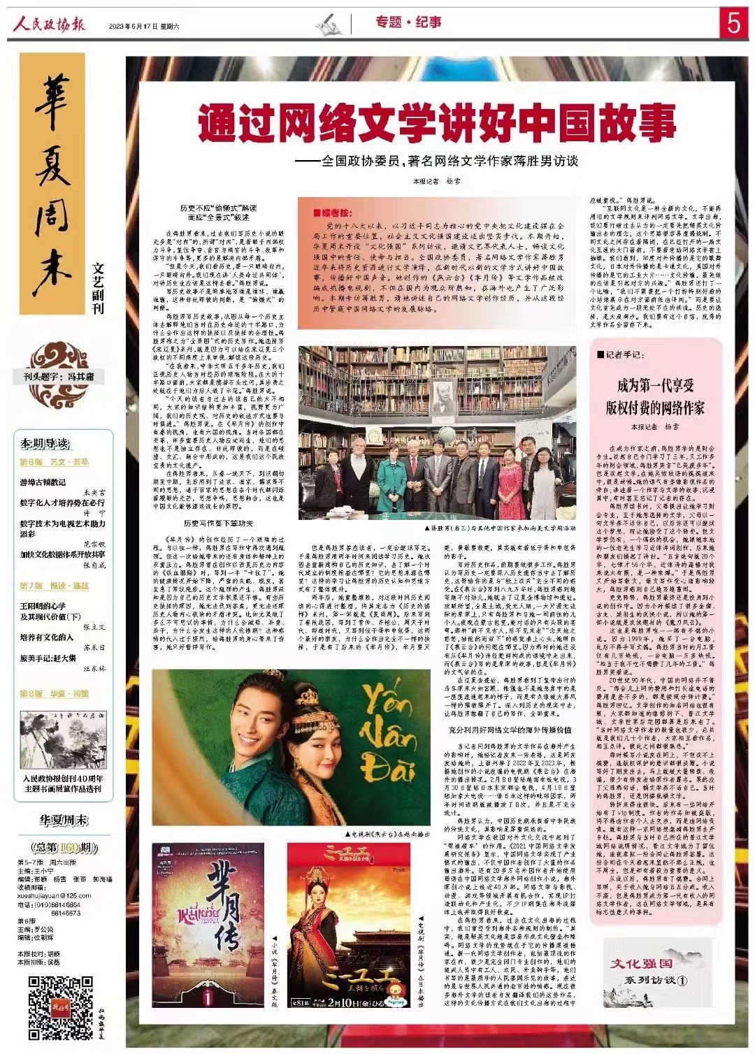党的十八大以来,以习近平同志为核心的党中央把文化建设摆在全局工作的重要位置,社会主义文化强国建设迈出坚实步伐。本期开始,华夏周末开设“文化强国”系列访谈,邀请文艺界代表人士,畅谈文化强国中的责任、使命与担当。全国政协委员,著名网络文学作家蒋胜男近年来将历史资源进行文学演绎,在新时代以新的文学方式讲好中国故事,传播好中国声音。她创作的《燕云台》《芈月传》等文学作品被改编成热播电视剧,不但在国内为观众所熟知,在海外也产生了广泛影响。本期专访蒋胜男,请她讲述自己的网络文学创作经历,并从这段经历中管窥中国网络文学的发展脉络。
