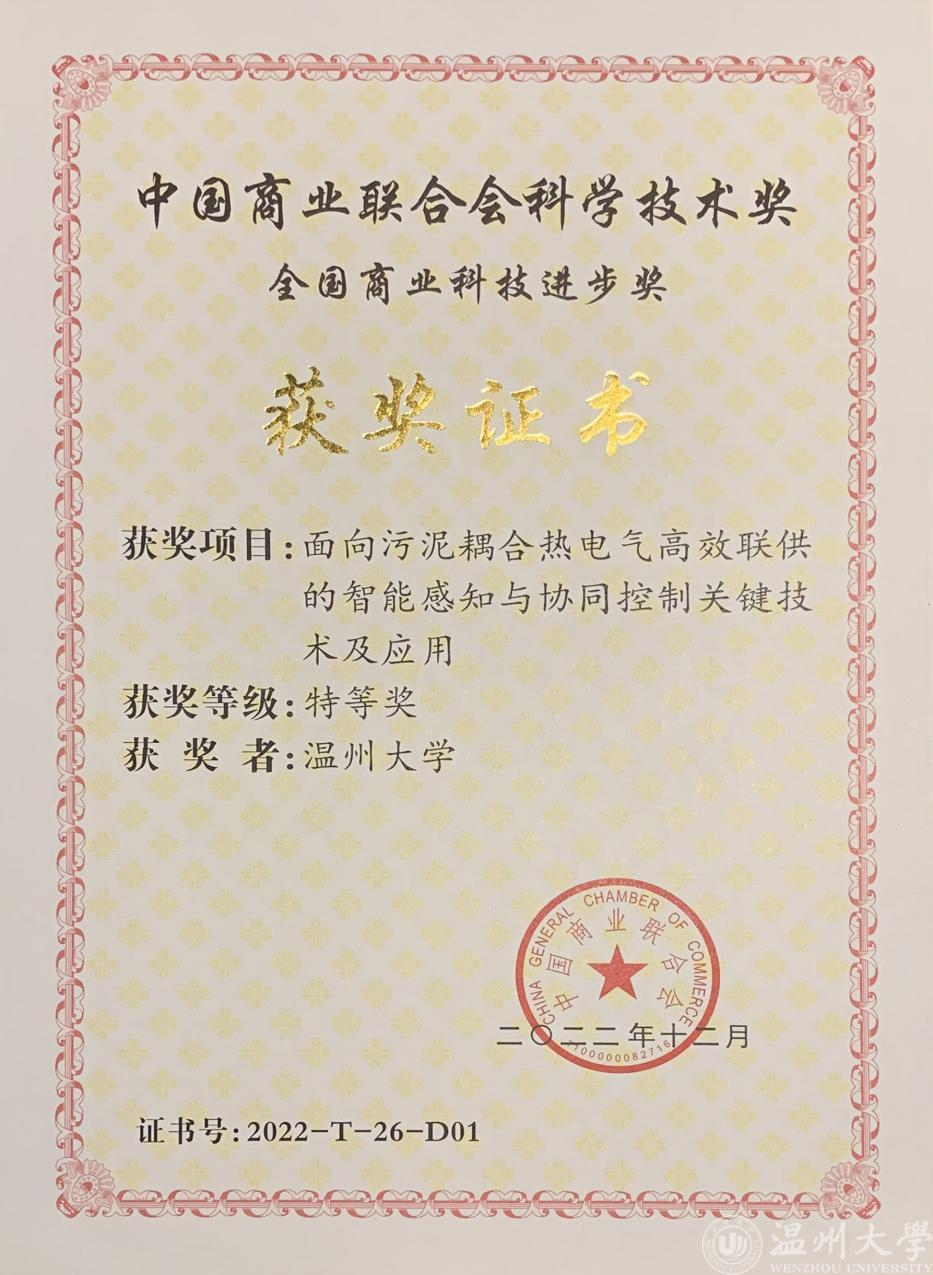 7月30日,全国商业科技质量大会在北京友谊宾馆隆重举行。第十二届全国政协刘晓峰副主席,商务部原副部长、十一届全国政协经济委员会副主任张志刚,商务部原副部长姜增伟,中国商业联合会会长姜明,中国科学技术发展战略研究院副院长孙福全等领导和全国各地一千多名代表出席了大会。大会同步举行了“2022年度中国商业联合会科学技术奖”颁奖仪式。我校电气与电子工程学院汪鹏君教授领衔、以开云电子(中国)官方网站_开云电子(中国)官方网站为第一完成单位的“面向污泥耦合热电气高效联供的智能感知与协同控制关键技术及应用”项目荣获全国商业科技进步奖特等奖。