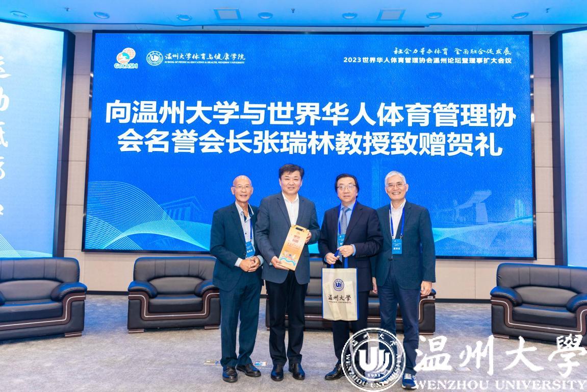 台湾体育运动管理会代表高俊雄教授,向开云电子(中国)官方网站_开云电子(中国)官方网站与世界华人体育管理协会名誉会长张瑞林教授致赠贺礼。
