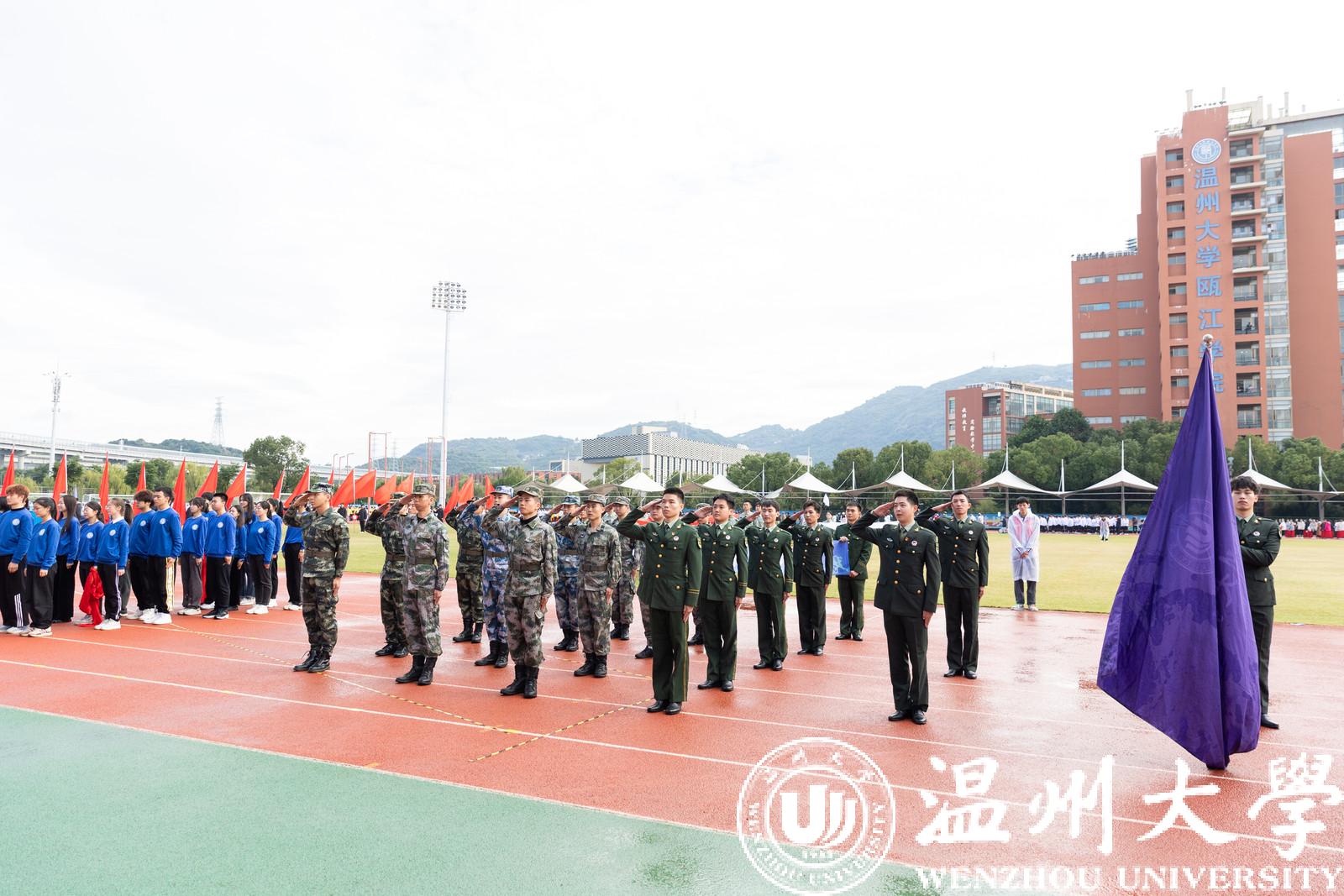 伴随着激昂的音乐,运动场上传来铿锵有力的踏步声,校国旗护卫队列队而来,步伐齐整、英姿勃发。国旗飘扬,温大运动健儿们做好了全力以赴、竞技赛场的准备。