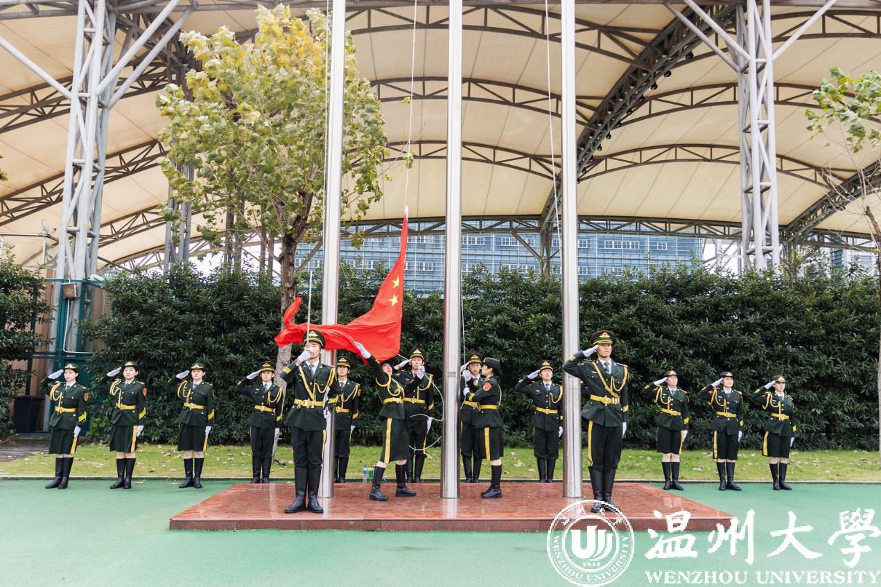 温大师生齐唱国歌,冉冉升起的五星红旗映照着璀璨阳光,正如温大人眼中闪烁的奋进光芒。