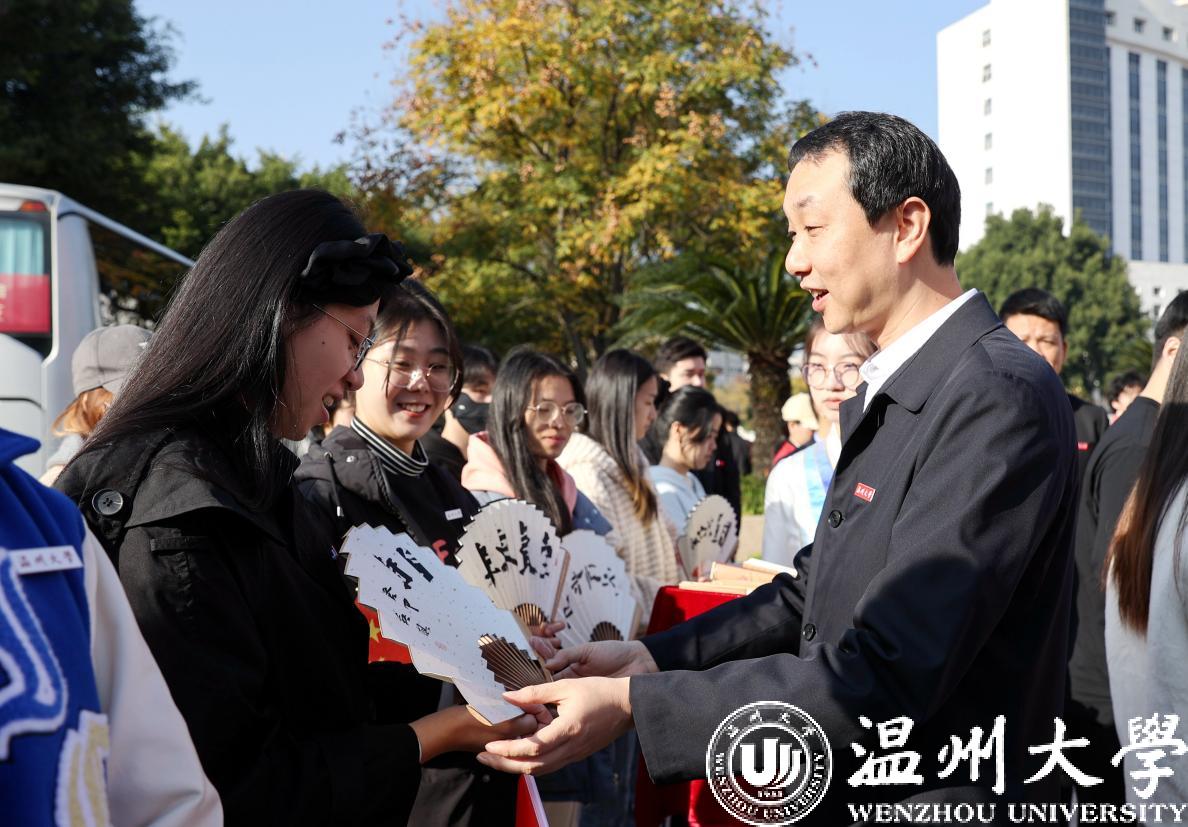仪式前,张健亲切慰问了师生演职人员,并为他们送上一份“特殊”的礼物。礼物是由美术与设计学院书法专业师生精心为歌剧《五星红旗》创作的文化扇,他们将对《五星红旗》巡演的美好祝福寄托于走笔运墨所诞生的笔意情性中,这也是我校艺术类课程思政化全方位融合的生动体现。