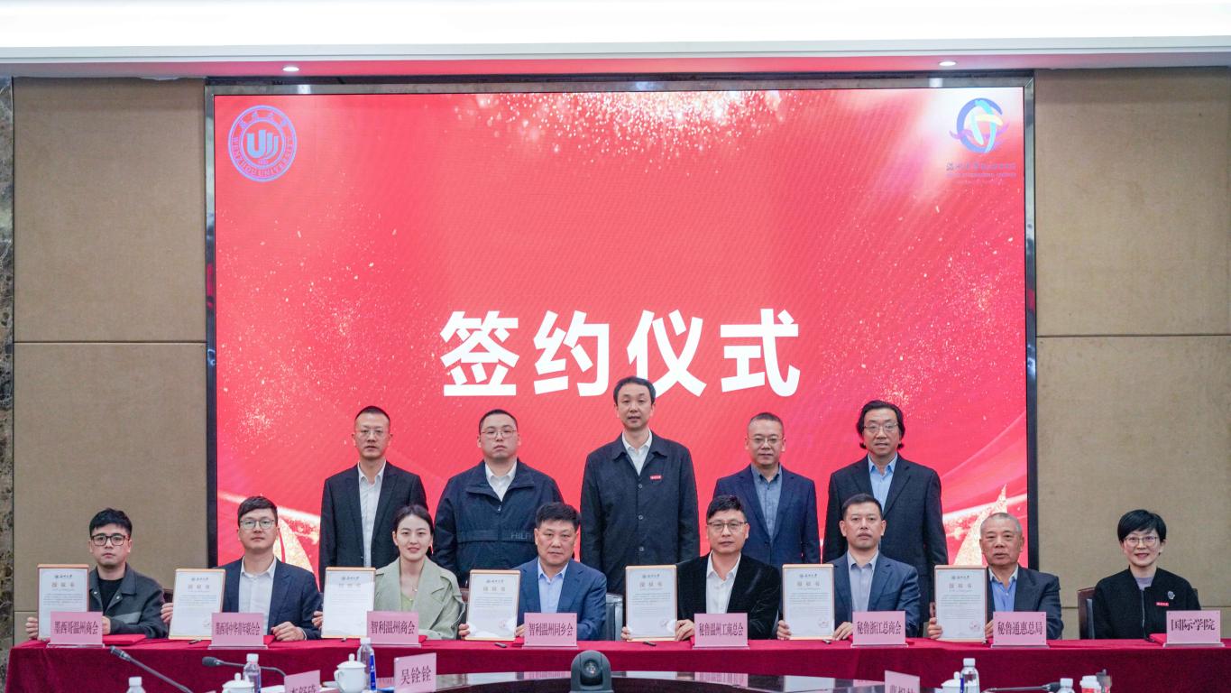 在市、区侨联领导和校领导的共同见证下,国际教育学院负责人与秘鲁通惠总局主席沈达坚、秘鲁浙江总商会会长楼兵强、秘鲁温州工商总会代会长张剑英、智利温州同乡会名誉会长林良松、智利温州商会副会长吴宾洁、墨西哥中华青年联合会副会长陈温畅及墨西哥温州商会副会长林浩敏等7位侨团代表一同签署了合作协议,并为各位代表颁发开展“留学温大”招生宣传相关工作的授权书。