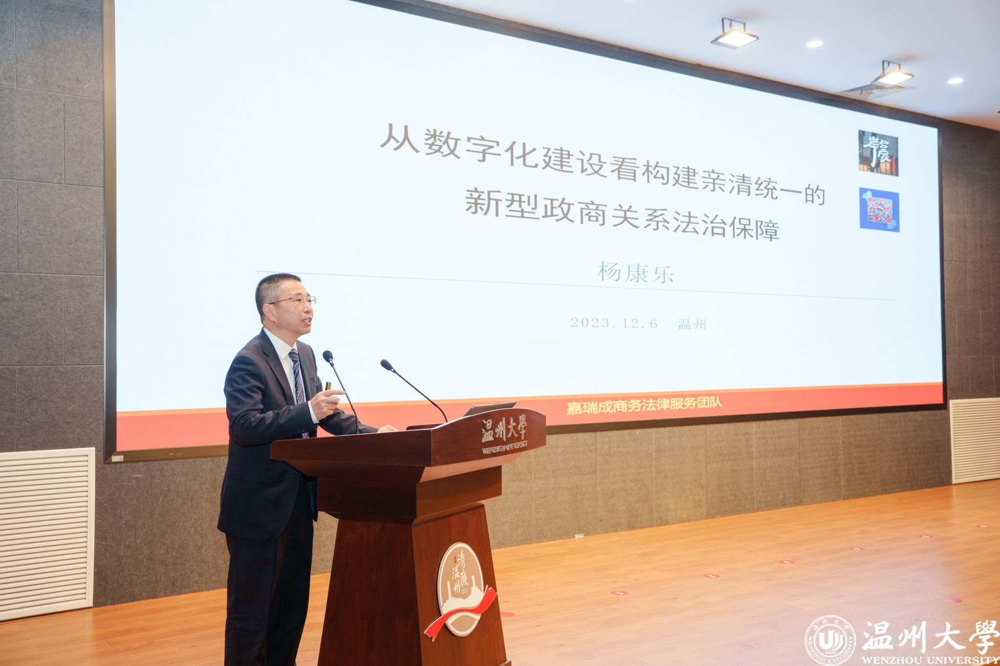 浙江嘉瑞成律师事务所首席合伙人杨康乐作题为《从数字化建设看构建亲清统一的新型政商关系法治保障》报告。他结合具体的法律案例分析了在亲清政商关系构建过程中出现的数字化问题。他强调,法治建设是数字化的底层逻辑,建议数字化与法治建设应当有机融合。结合法律实务,杨康乐从向前端延伸、在后端监督、以数字化为手段、法治化为基准等方面为构建亲清政商关系提供了方向。