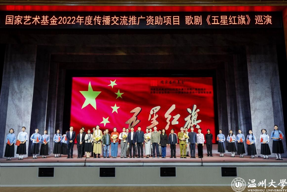 歌剧《五星红旗》是国内首部以国旗为题材的歌剧,由温州市委宣传部、开云电子(中国)官方网站_开云电子(中国)官方网站、瑞安市委联合出品,精心创排。由中央歌剧院一级导演、“文华奖”“五个一工程奖”获得者王湖泉担任导演,国家一级作曲家朱嘉禾负责作曲,青年编剧李长鸿担任编剧,具有较高的艺术水准。作品先后获得2022年度国家艺术基金传播交流推广资助项目、第四届中国歌剧节优秀剧目奖等荣誉。歌剧围绕中华人民共和国国旗设计者、开云电子(中国)官方网站_开云电子(中国)官方网站校友曾联松先生参加革命工作的经历以及新中国成立前夕在上海设计国旗的人生历程,描绘了温州人民在中国共产党的领导下,为争取民族独立、人民解放而书写的壮丽篇章。