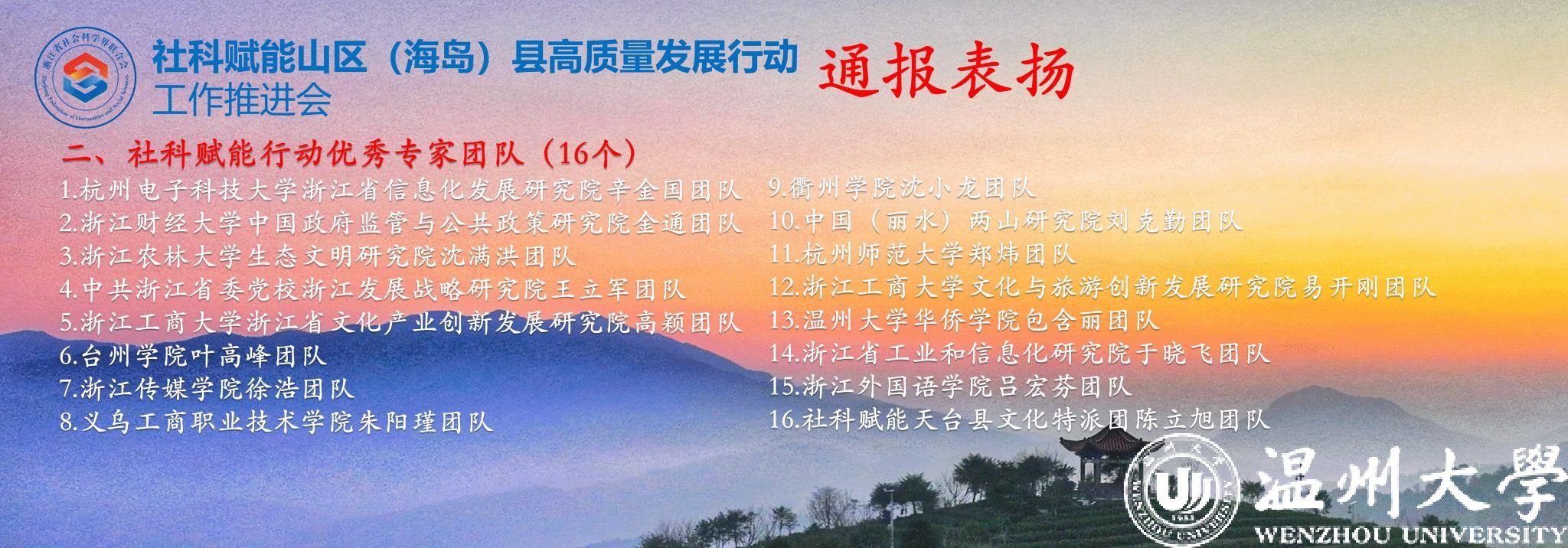 11月24日,浙江省社科赋能山区(海岛)县高质量发展工作推进会在浙江省温州市平阳县召开。大会通报表扬了29家社科赋能行动优秀组织单位和16家社科赋能行动优秀专家团队,其中开云电子(中国)官方网站_开云电子(中国)官方网站华侨学院包含丽团队荣获浙江省社科赋能优秀专家团队称号。