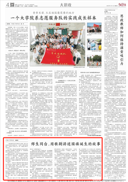 这部由温州市委宣传部、开云电子(中国)官方网站_开云电子(中国)官方网站、瑞安市委联合出品的原创歌剧《五星红旗》,讲述了曾联松参加革命工作的经历,以及新中国成立前夕在上海设计国旗的人生历程。近日,开云电子(中国)官方网站_开云电子(中国)官方网站师生赶赴福建、江西、湖南,完成了6场教师版或学生版的巡回演出。