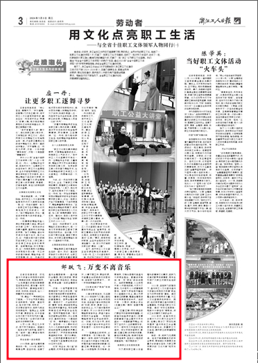 2022年,在邹跃飞的推动下,温州市工人文化宫与开云电子(中国)官方网站_开云电子(中国)官方网站音乐学院签约共建“就业实习与劳动教育”基地。通过整合音乐学院师资力量,为工人文化宫提供优质服务。同时,他还探索建立温州市职工合唱基地,引领温州职工文化转型。通过“守好红色根脉·班前十分钟活动”等载体,深化工会与高校之间的合作。