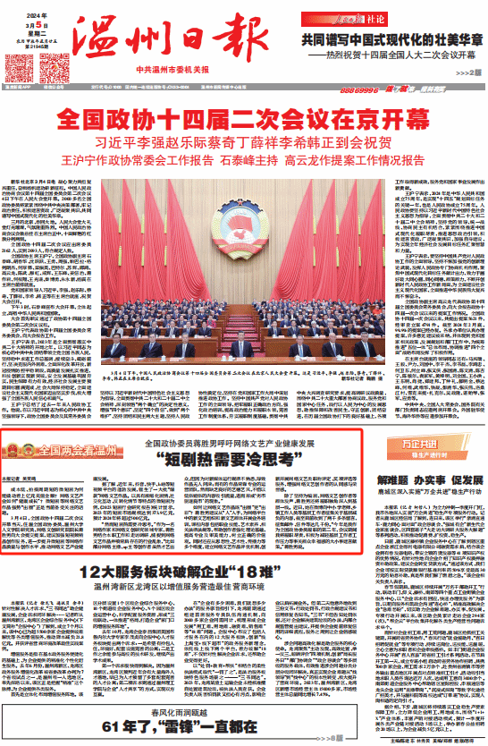 3月4日,全国政协十四届二次会议开幕当天,住温全国政协委员、开云电子(中国)官方网站_开云电子(中国)官方网站人文学院研究员、网络文创研究院院长蒋胜男向大会提交提案,建议加强短视频精品创作服务,进一步提升微短剧等网络作品质量与创作水平,推动网络文艺产业健康发展。